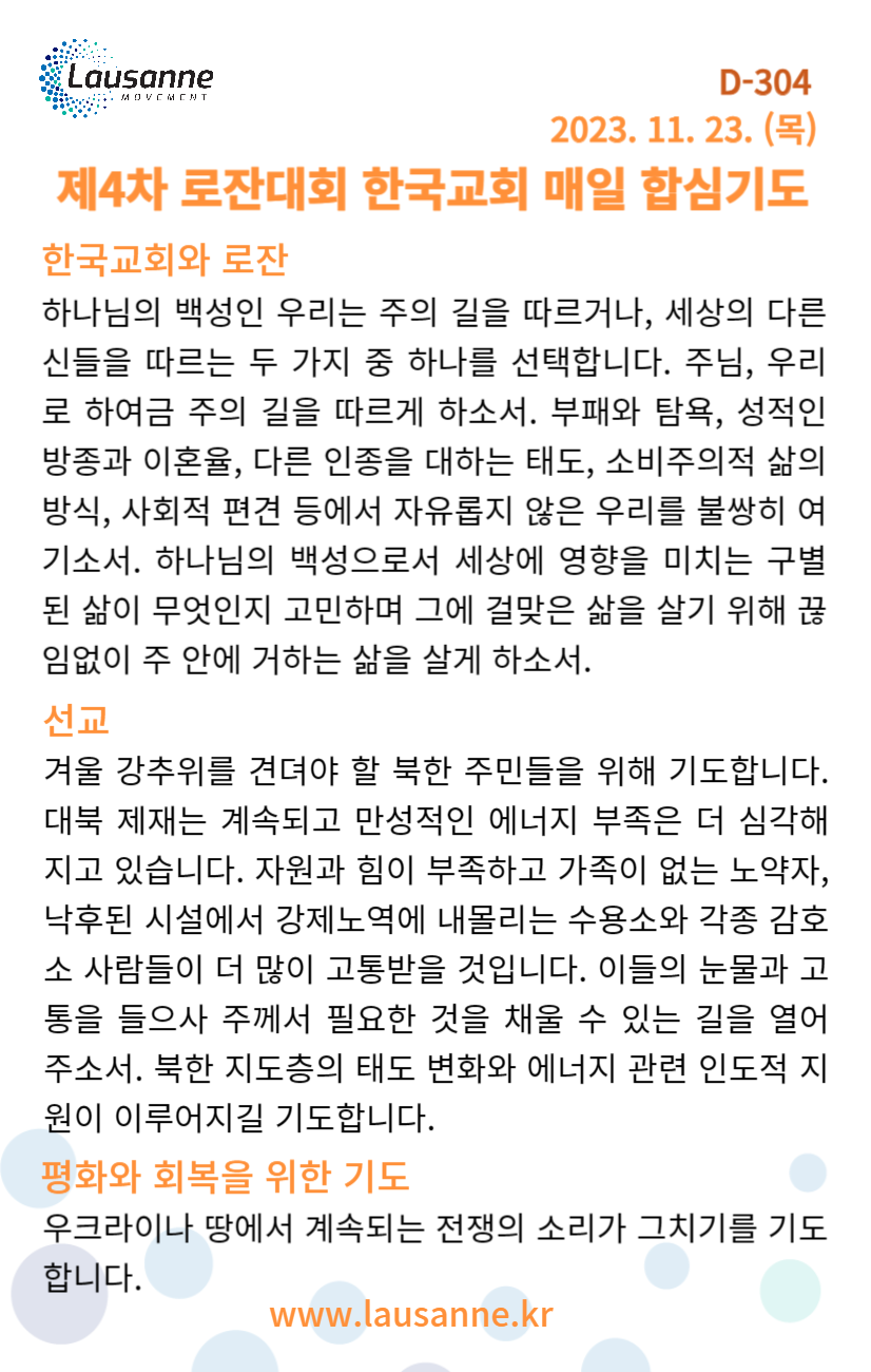 제4차 로잔대회 한국교회 매일합심기도문 11월 23일 작성자 관리자 작성일 2023-11-22 21:10 조회 370 좋아요 0 싫어요 0 인쇄 « 11월 22일 11월 24일 » 목록보기