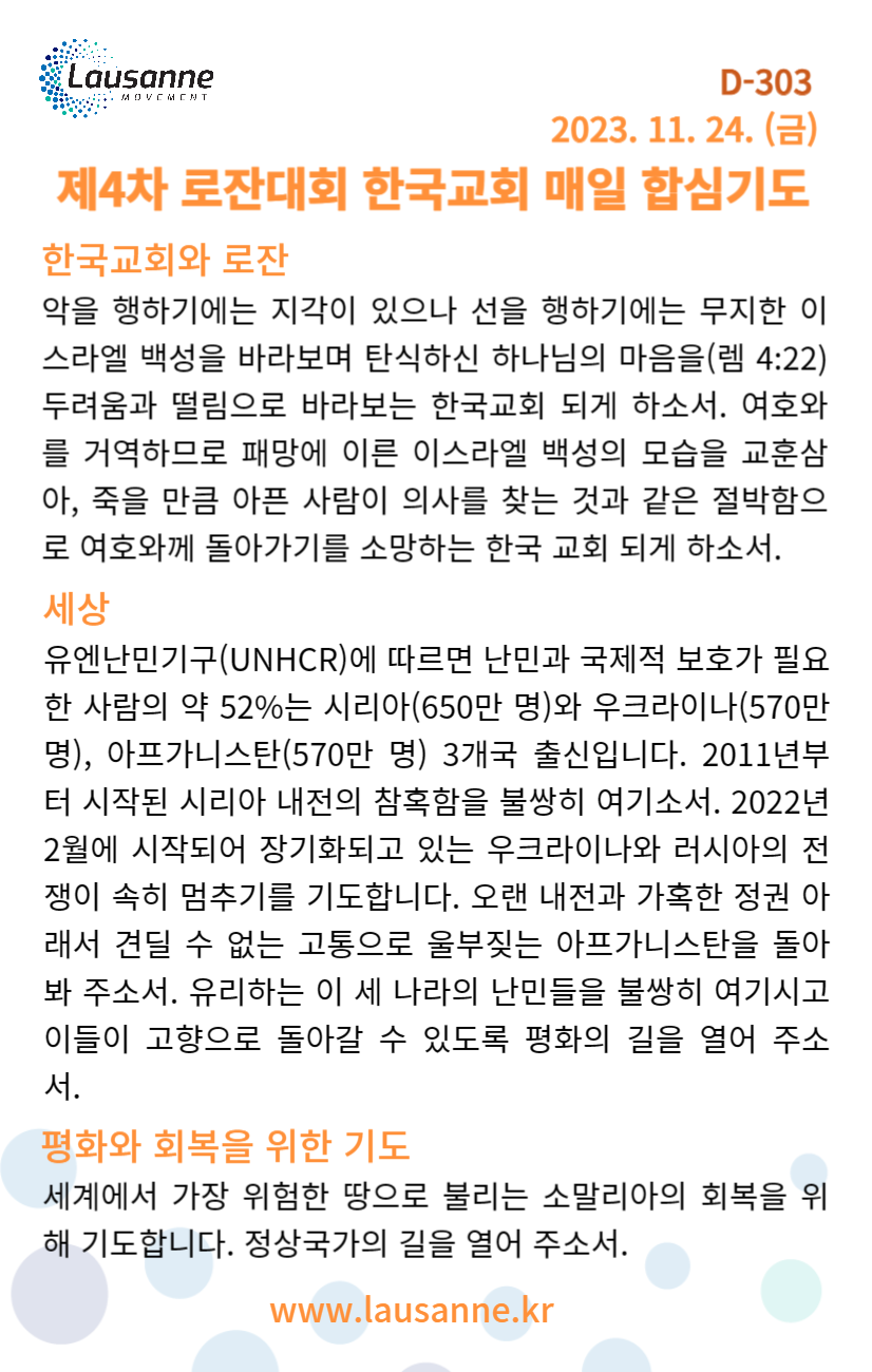 제4차 로잔대회 한국교회 매일합심기도문 11월 24일 작성자 관리자 작성일 2023-11-23 23:26 조회 375 좋아요 0 싫어요 0 인쇄 « 11월 23일 11월 25일 » 목록보기