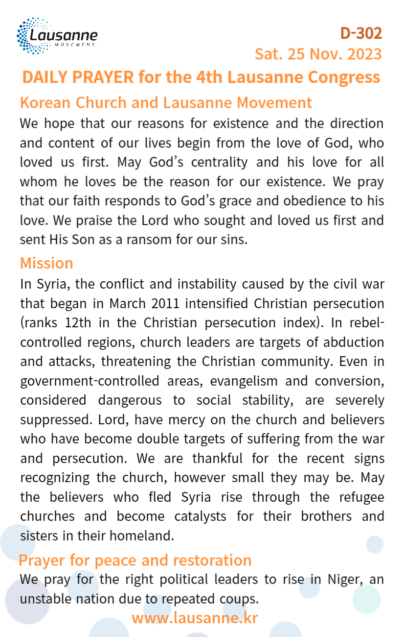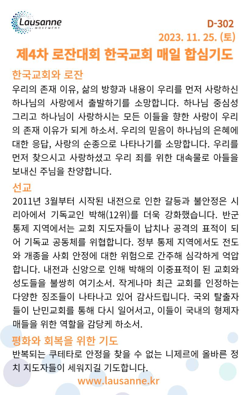 제4차 로잔대회 한국교회 매일합심기도문 11월 25일 작성자 관리자 작성일 2023-11-24 19:57 조회 377 좋아요 0 싫어요 0 인쇄 « 11월 24일 11월 26일 » 목록보기