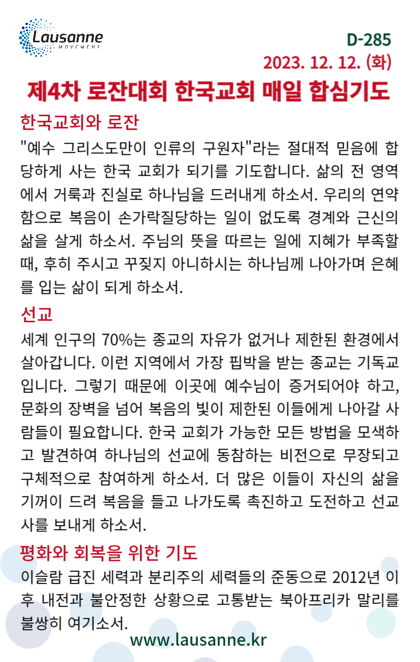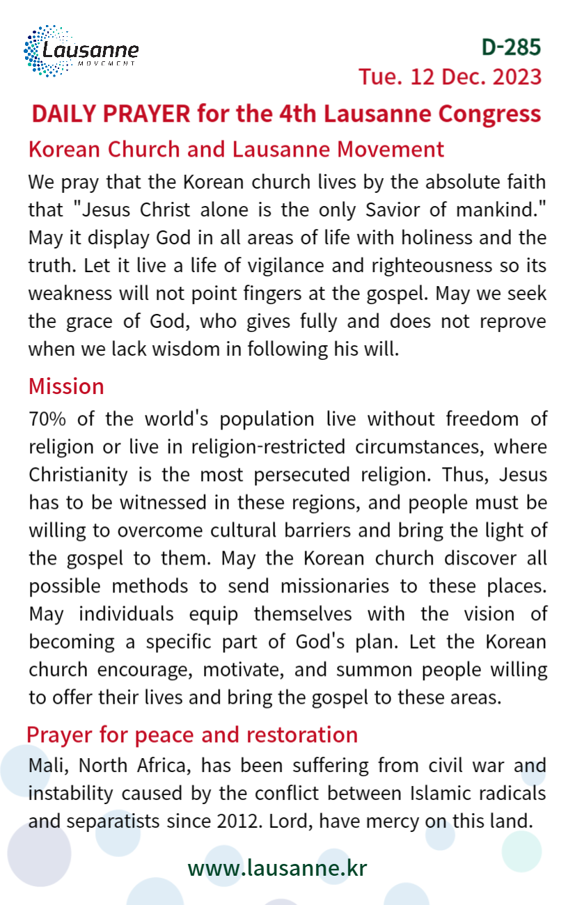 제4차 로잔대회 한국교회 매일합심기도문 12월 12일 작성자 관리자 작성일 2023-12-12 05:34 조회 379 좋아요 0 싫어요 0 인쇄 « 12월 11일 12웧 13일 » 목록보기