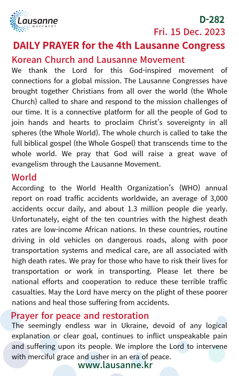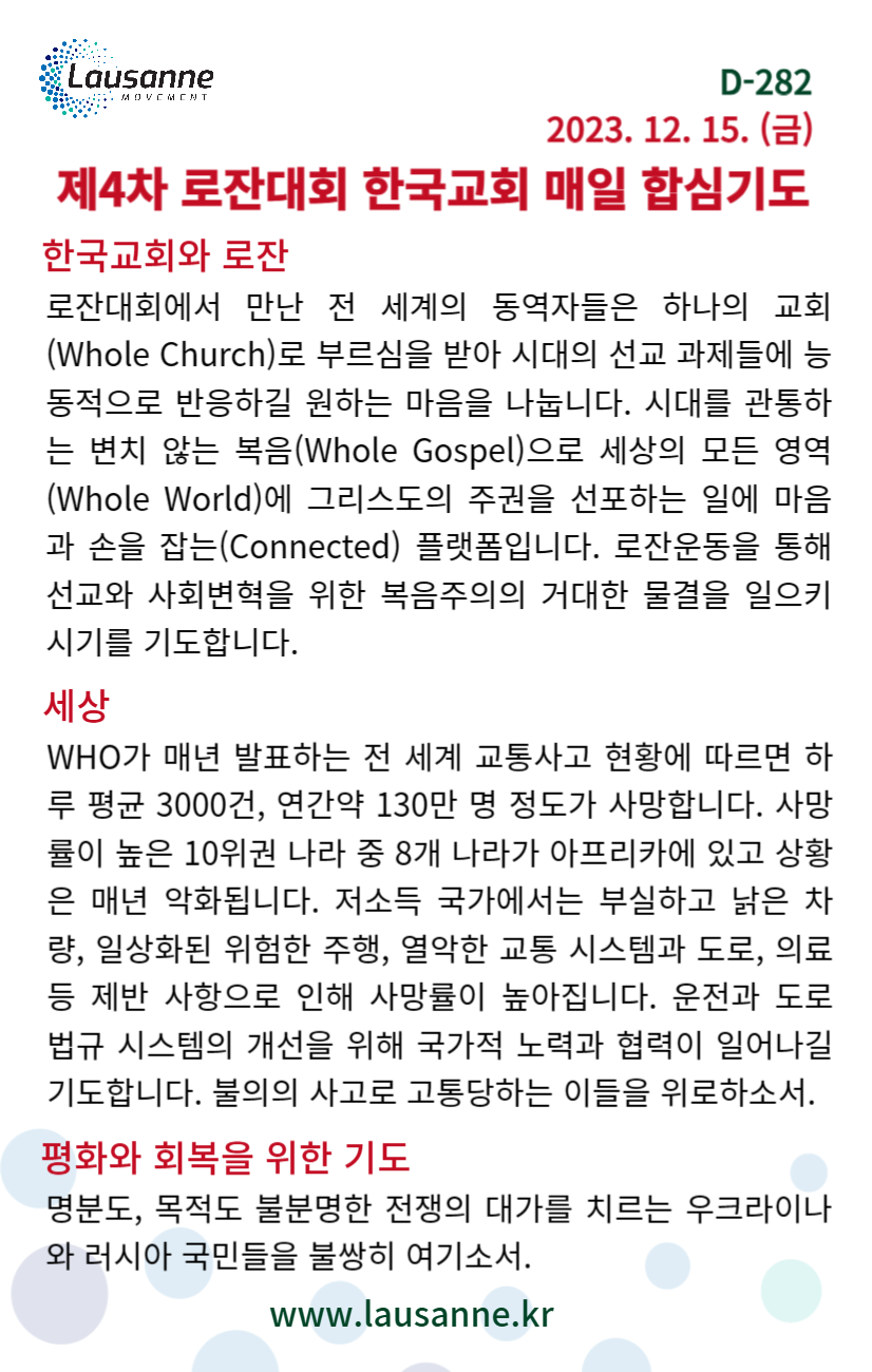 제4차 로잔대회 한국교회 매일합심기도문 12월 15일 작성자 관리자 작성일 2023-12-14 20:07 조회 341 좋아요 0 싫어요 0 인쇄 « 12월 14일 12월 16일 » 목록보기
