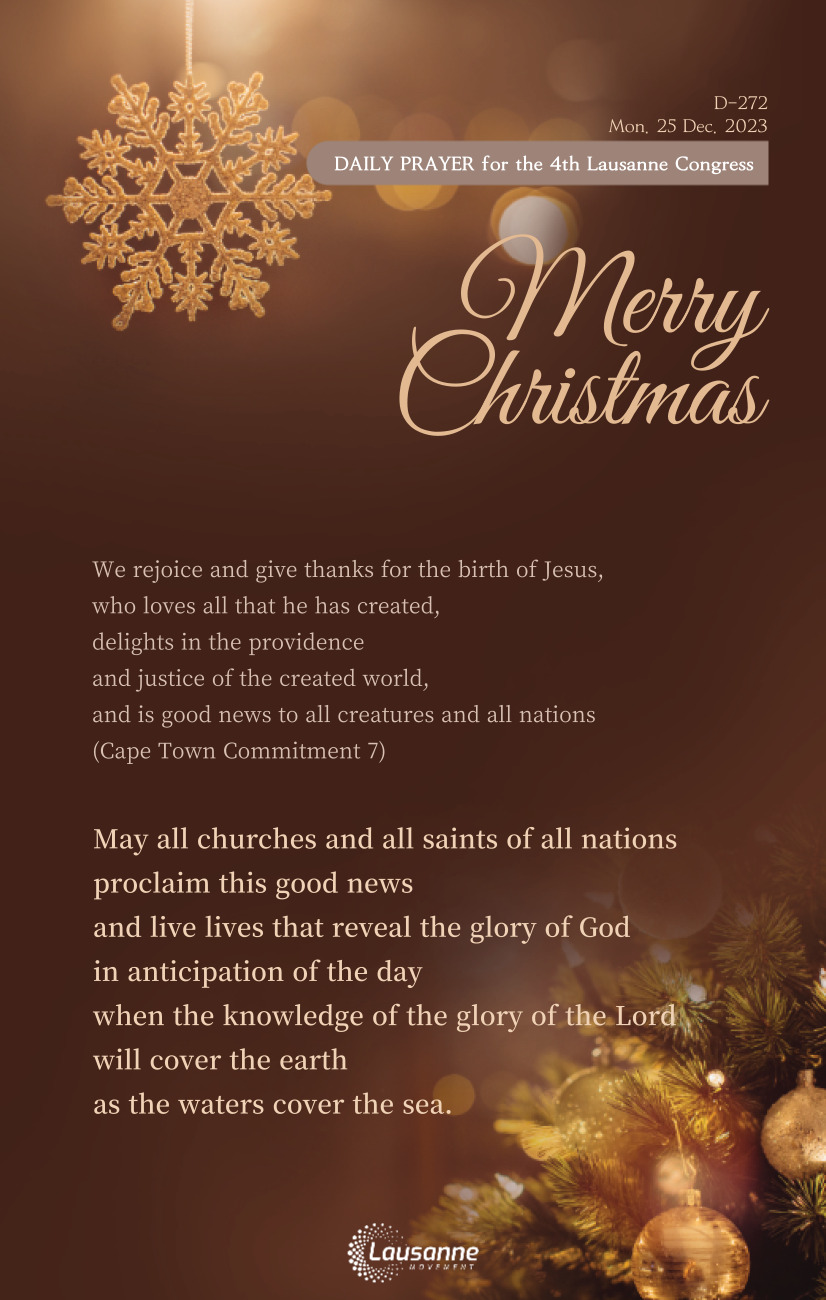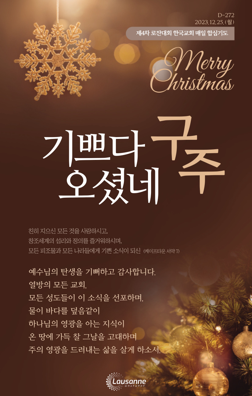 제4차 로잔대회 한국교회 매일합심기도문 12월 25일 작성자 관리자 작성일 2023-12-24 18:57 조회 398 좋아요 0 싫어요 0 인쇄 « 12월 24일 12월 26일 » 목록보기