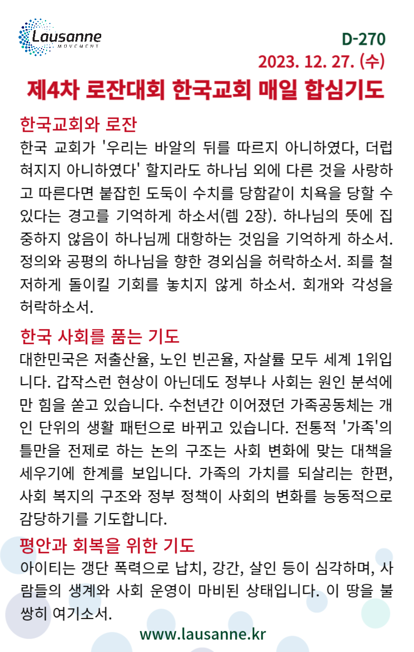 제4차 로잔대회 한국교회 매일합심기도문 12월 27일 작성자 관리자 작성일 2023-12-26 20:59 조회 279 좋아요 0 싫어요 0 인쇄 « 12월 26일 12월 28일 » 목록보기
