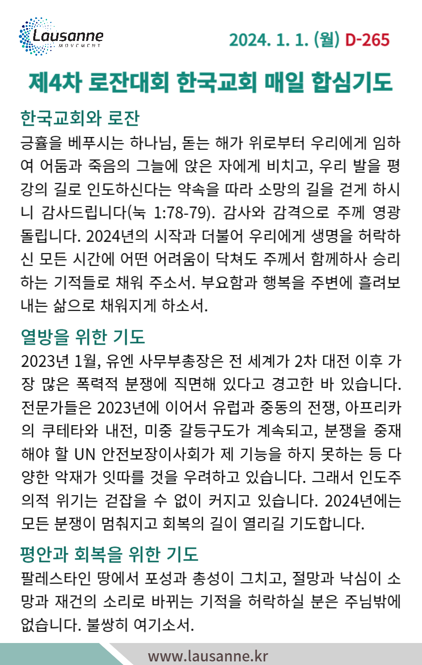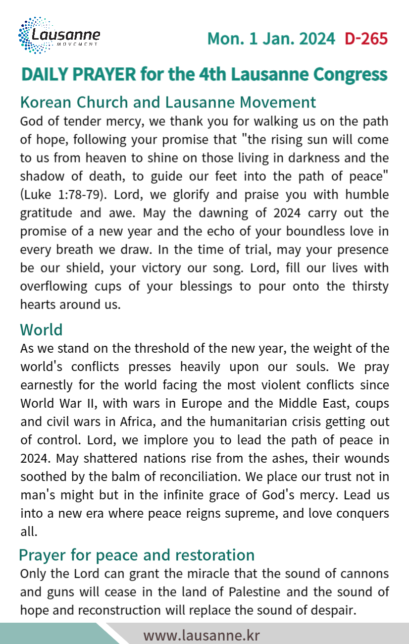 제4차 로잔대회 한국교회 매일합심기도문 2024년 1월 1일 작성자 관리자 작성일 2023-12-31 23:31 조회 382 좋아요 0 싫어요 0 인쇄 « 12월 31일 1월 2일 » 목록보기