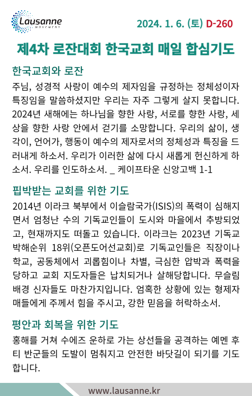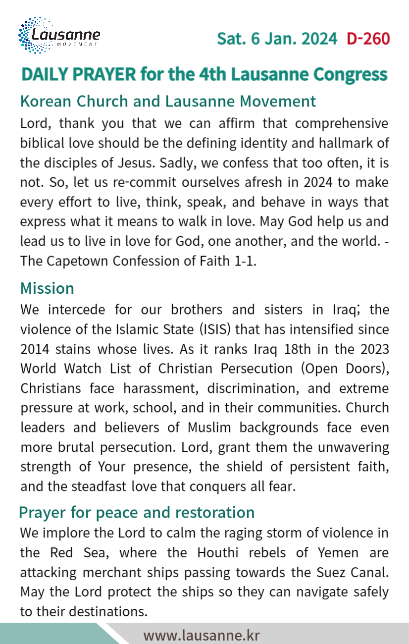 제4차 로잔대회 한국교회 매일합심기도문