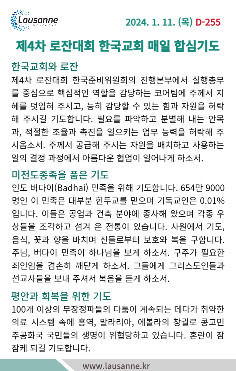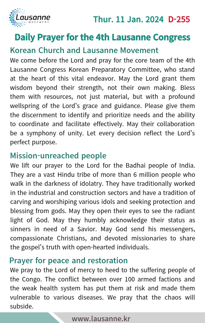 제4차 로잔대회 한국교회 매일합심기도문 1월 11일 작성자 관리자 작성일 2024-01-10 22:59 조회 278 좋아요 0 싫어요 0 인쇄 « 1월 10일 1월 12일 » 목록보기