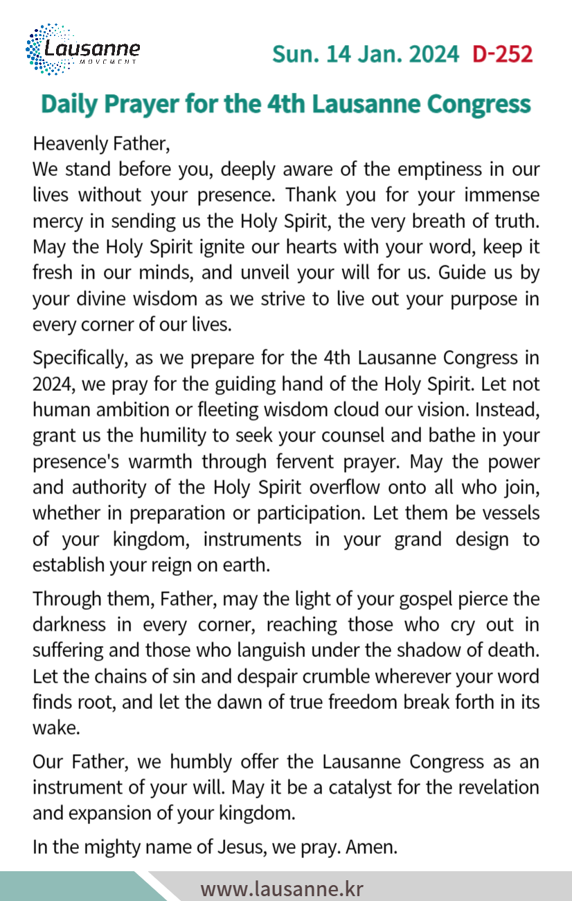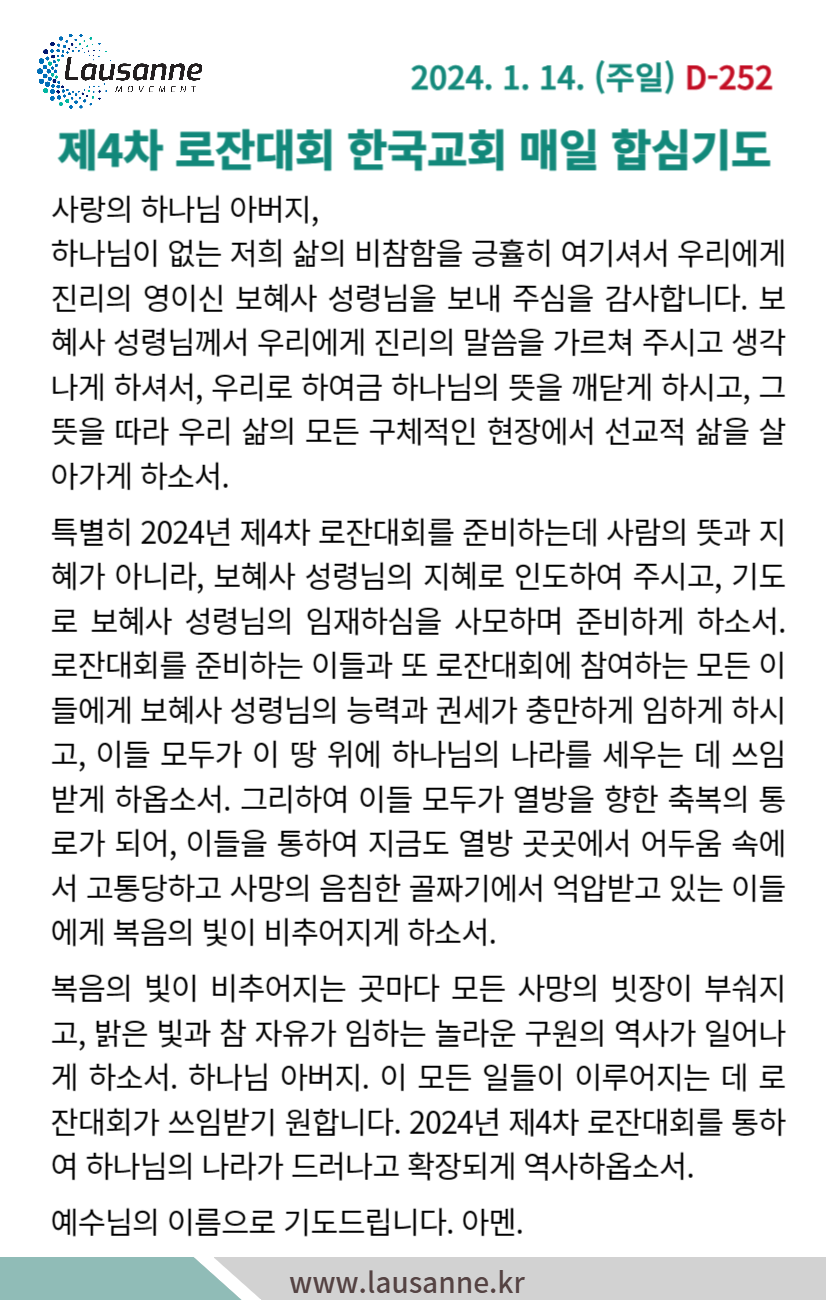제4차 로잔대회 한국교회 매일합심기도문 1월 14일 작성자 관리자 작성일 2024-01-13 19:23 조회 265 좋아요 0 싫어요 0 인쇄 « 1월 13일 1월 15일 » 목록보기