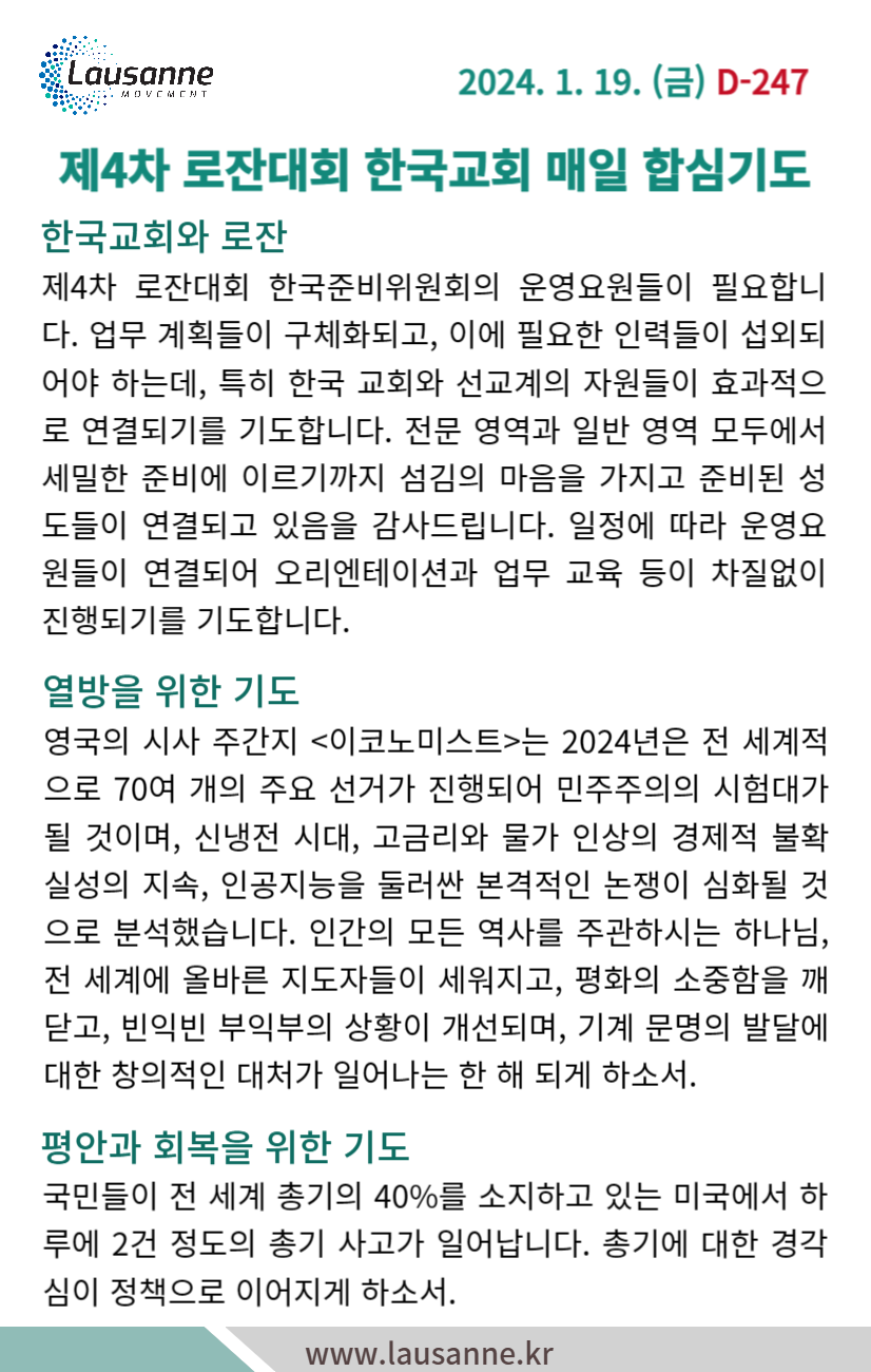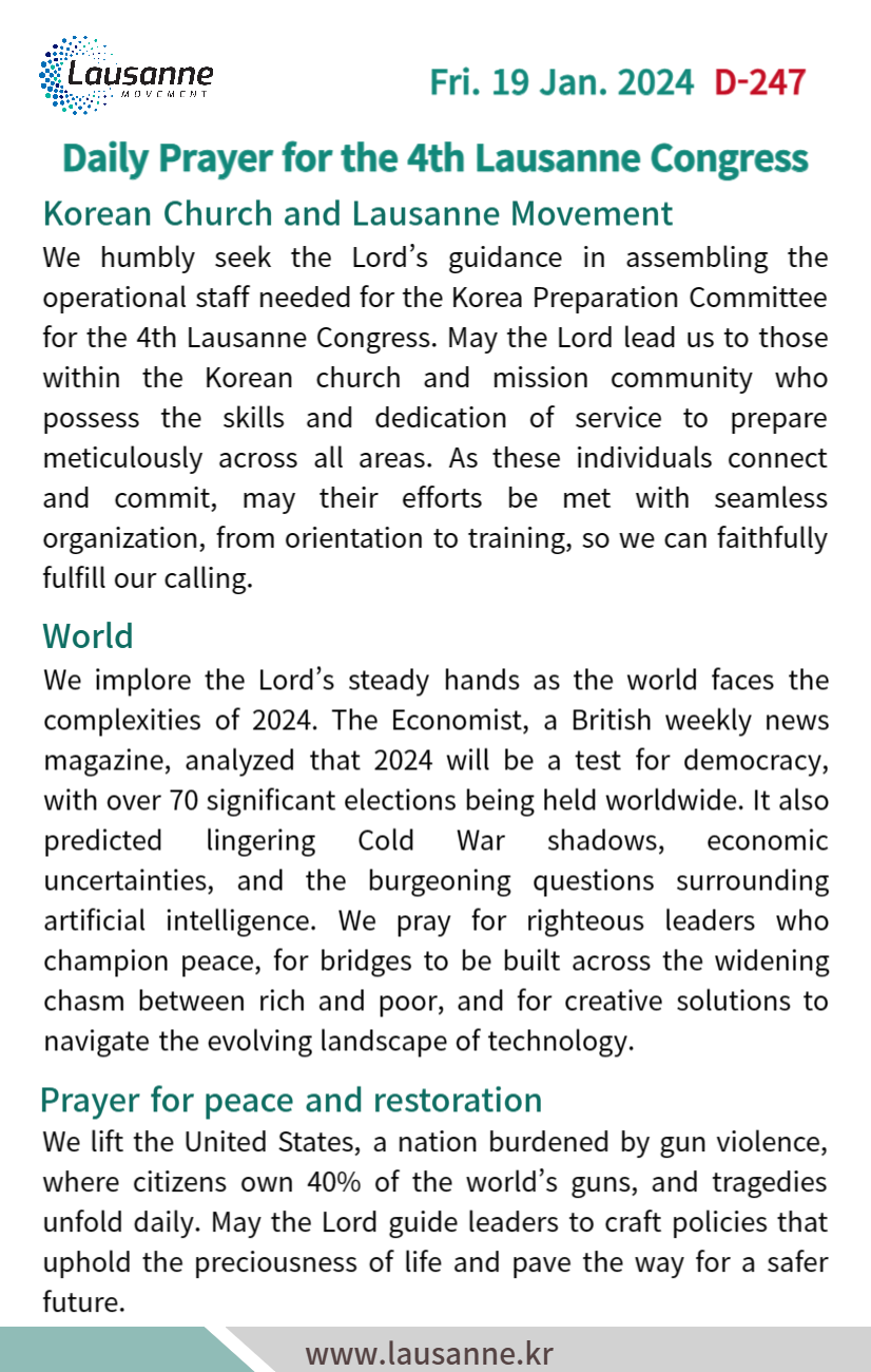 제4차 로잔대회 한국교회 매일합심기도문 1월 19일 작성자 관리자 작성일 2024-01-18 20:41 조회 363 좋아요 0 싫어요 0 인쇄 « 1월 18일 1월 20일 » 목록보기