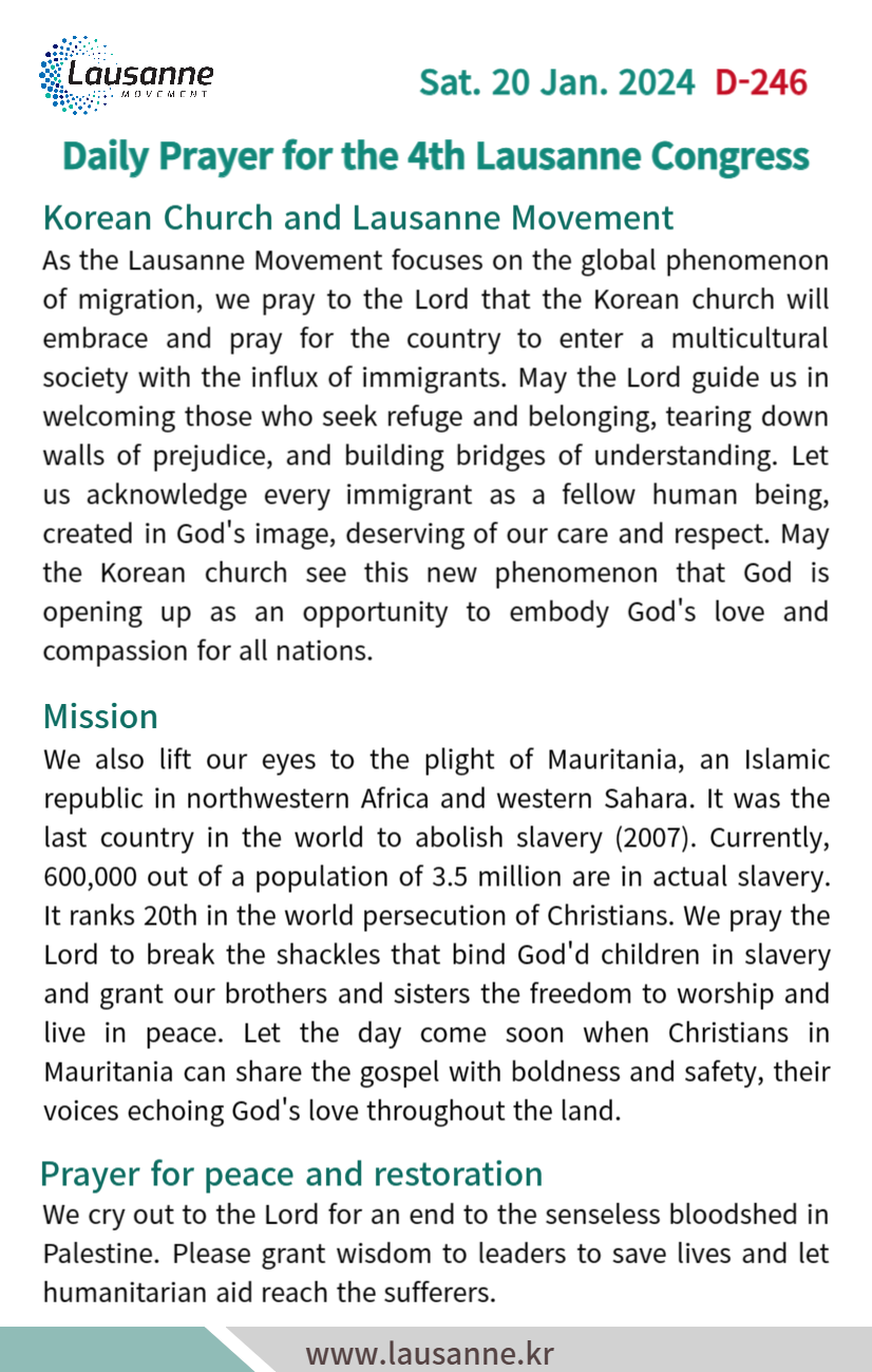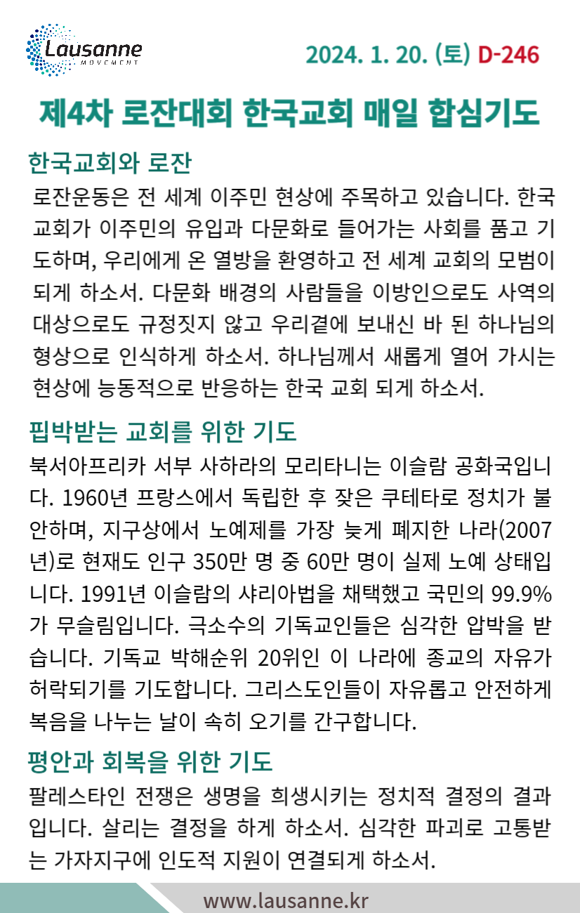 제4차 로잔대회 한국교회 매일합심기도문 1월 20일 작성자 관리자 작성일 2024-01-19 19:24 조회 264 좋아요 0 싫어요 0 인쇄 « 1월 19일 1월 21일 » 목록보기