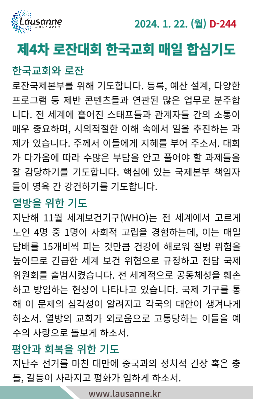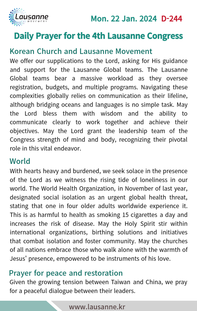 제4차 로잔대회 한국교회 매일합심기도문 1월 22일 작성자 관리자 작성일 2024-01-21 21:15 조회 332 좋아요 0 싫어요 0 인쇄 « 1월 21일 1월 23일 » 목록보기