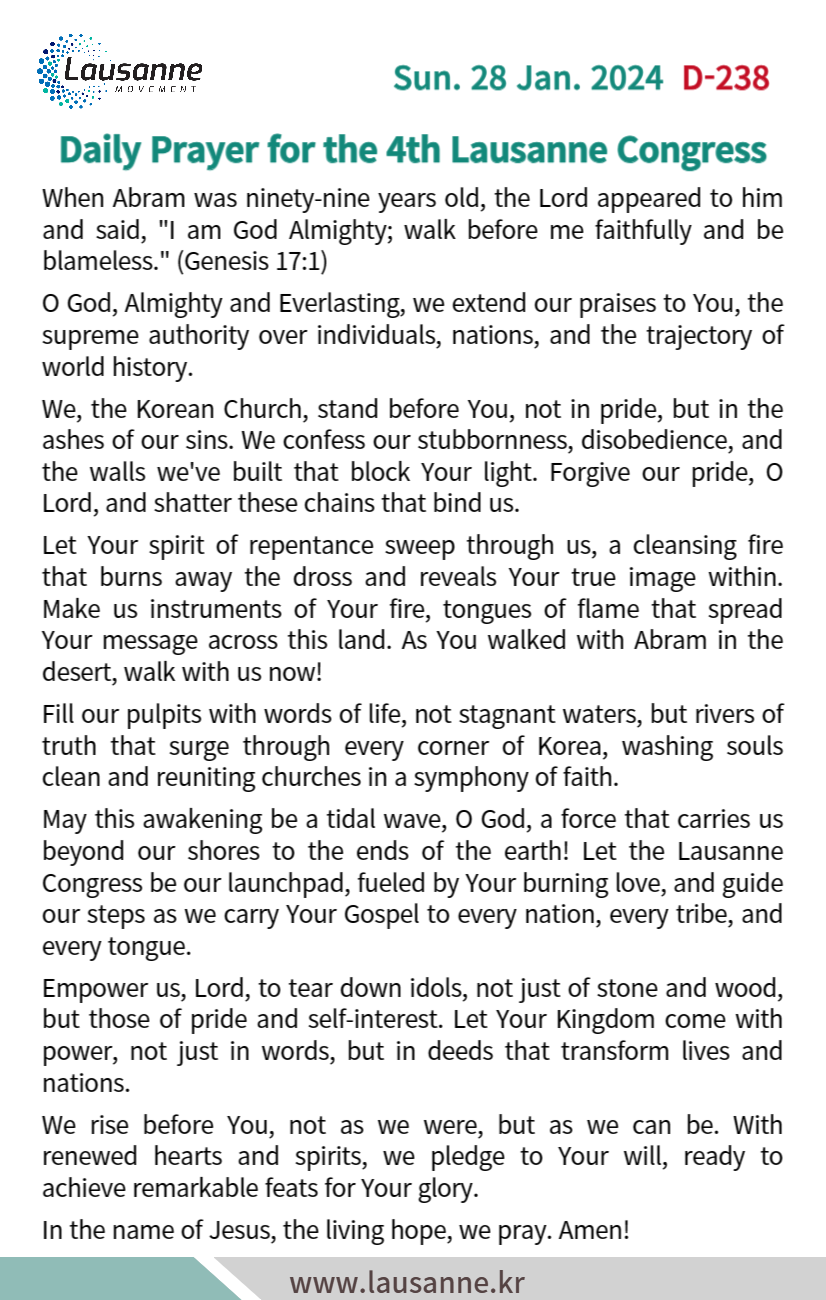 제4차 로잔대회 한국교회 매일합심기도문 1월 28일 작성자 관리자 작성일 2024-01-27 19:23 조회 324 좋아요 0 싫어요 0 인쇄 « 1월 27일 1월 29일 » 목록보기