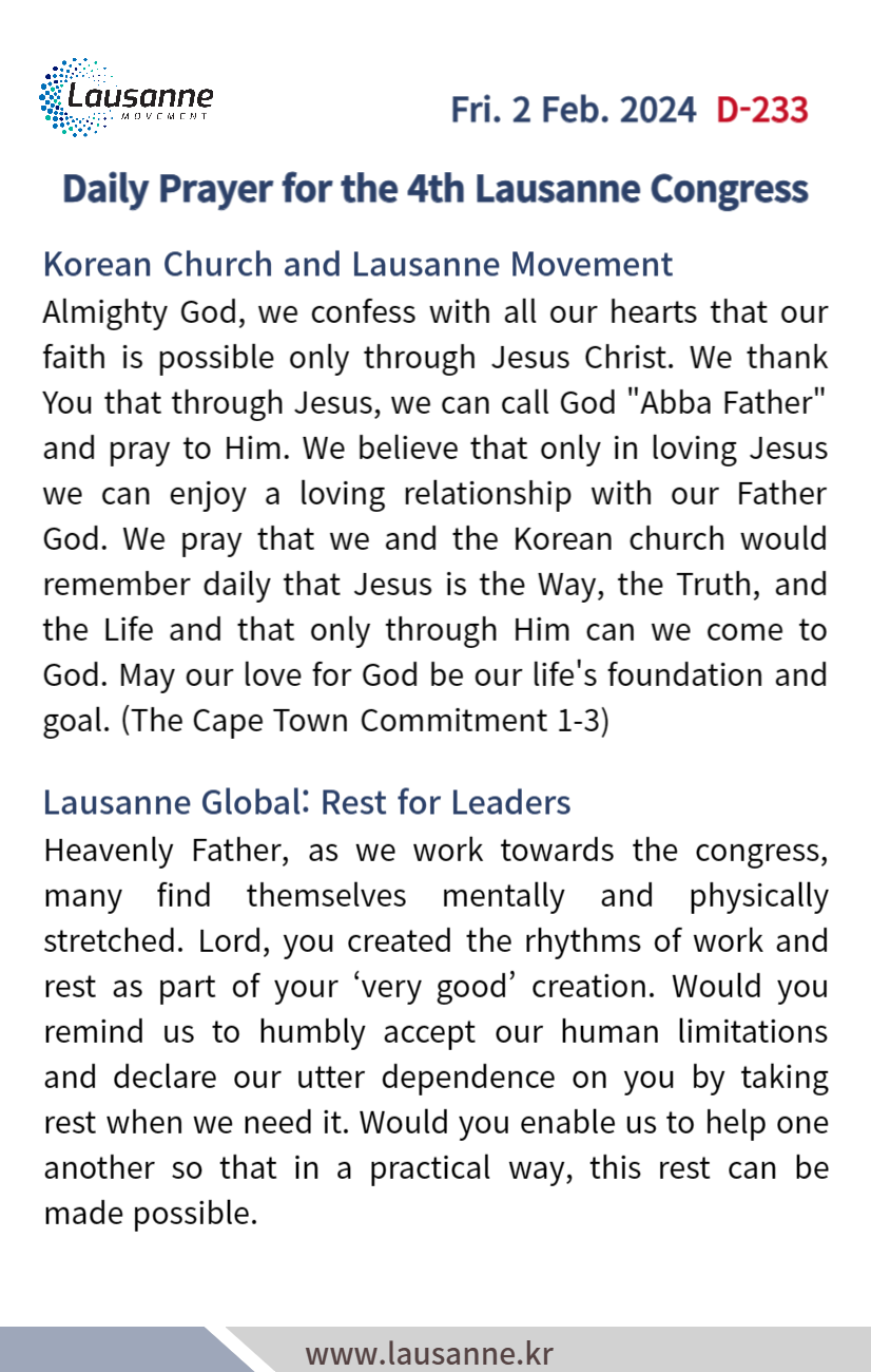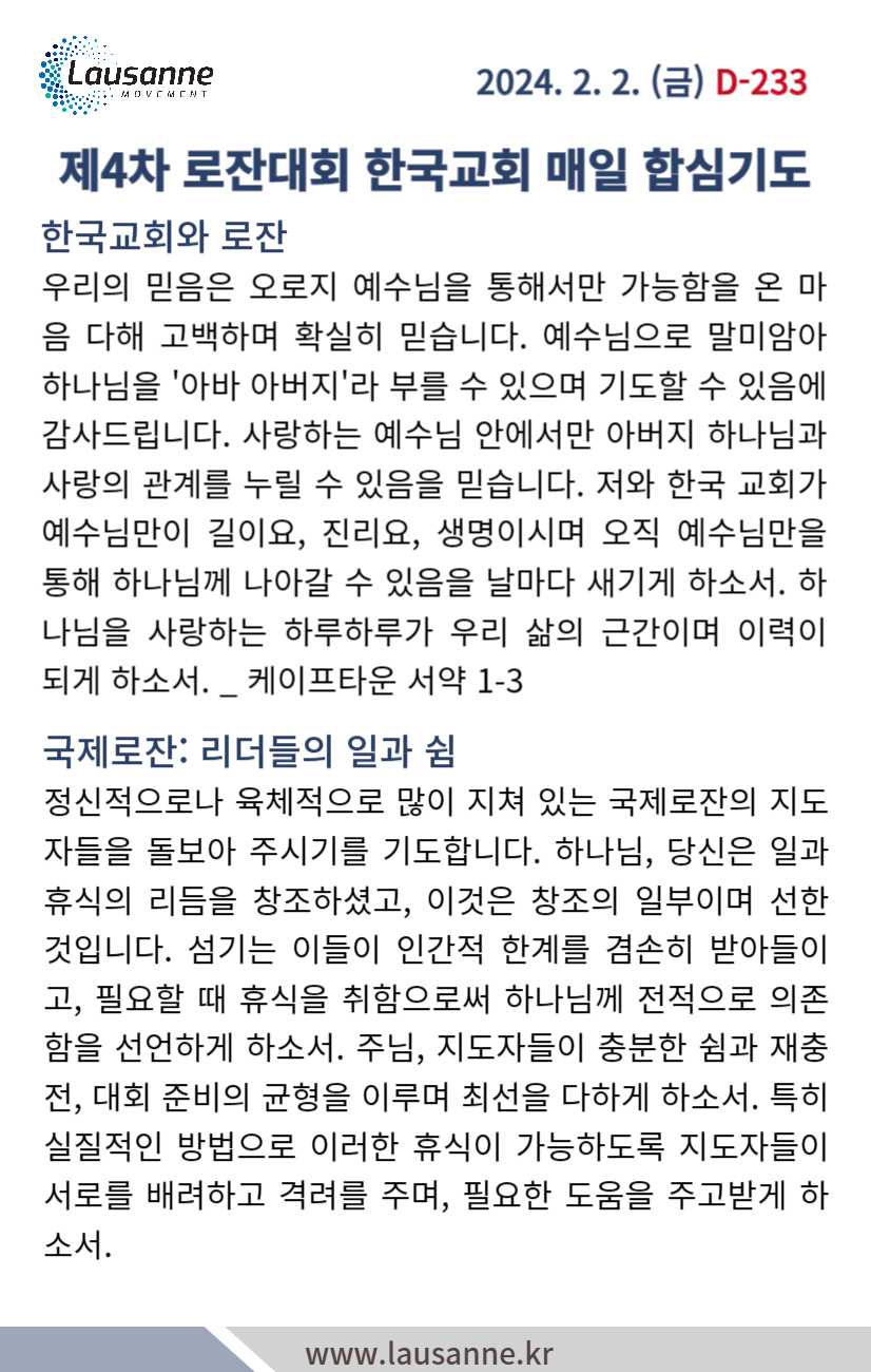 제4차 로잔대회 한국교회 매일합심기도문