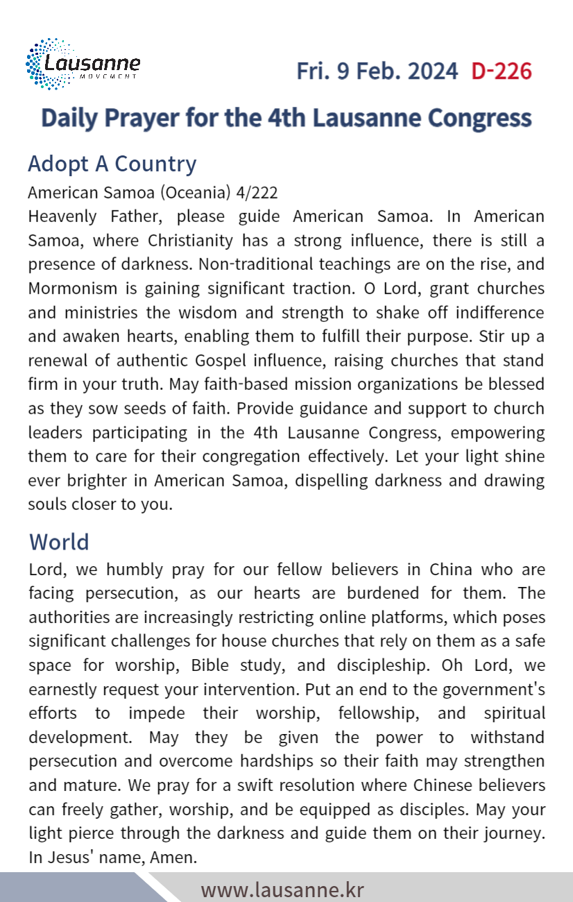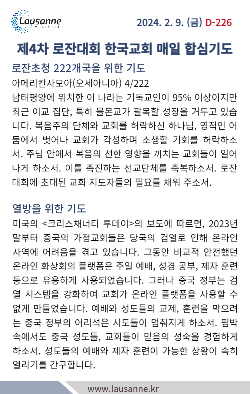 제4차 로잔대회 한국교회 매일합심기도문