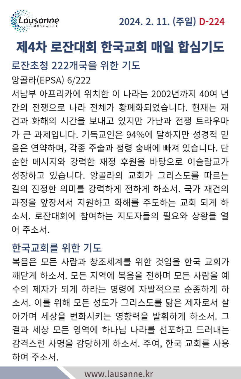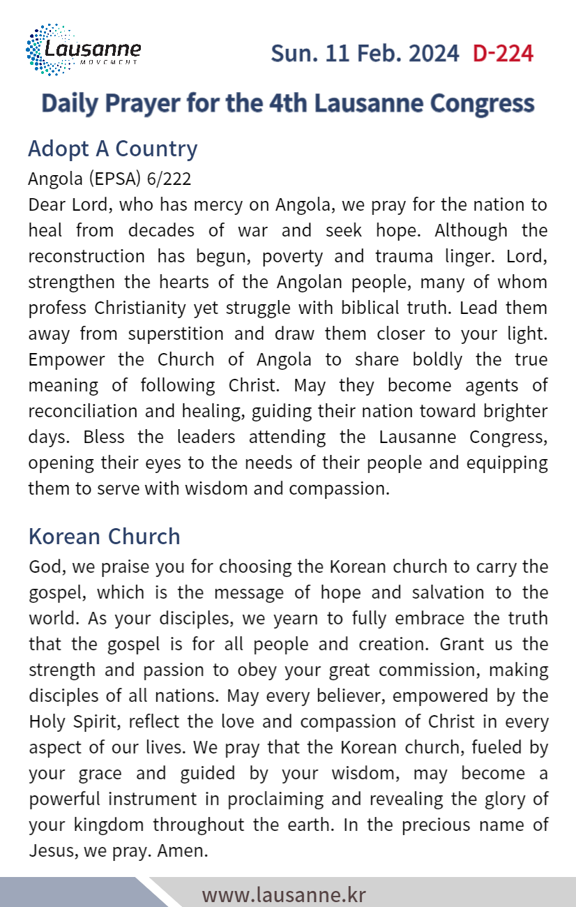제4차 로잔대회 한국교회 매일합심기도문 2월 11일 작성자 관리자 작성일 2024-02-10 19:44 조회 284 좋아요 0 싫어요 0 인쇄 « 2월 10일 2월 12일 » 목록보기