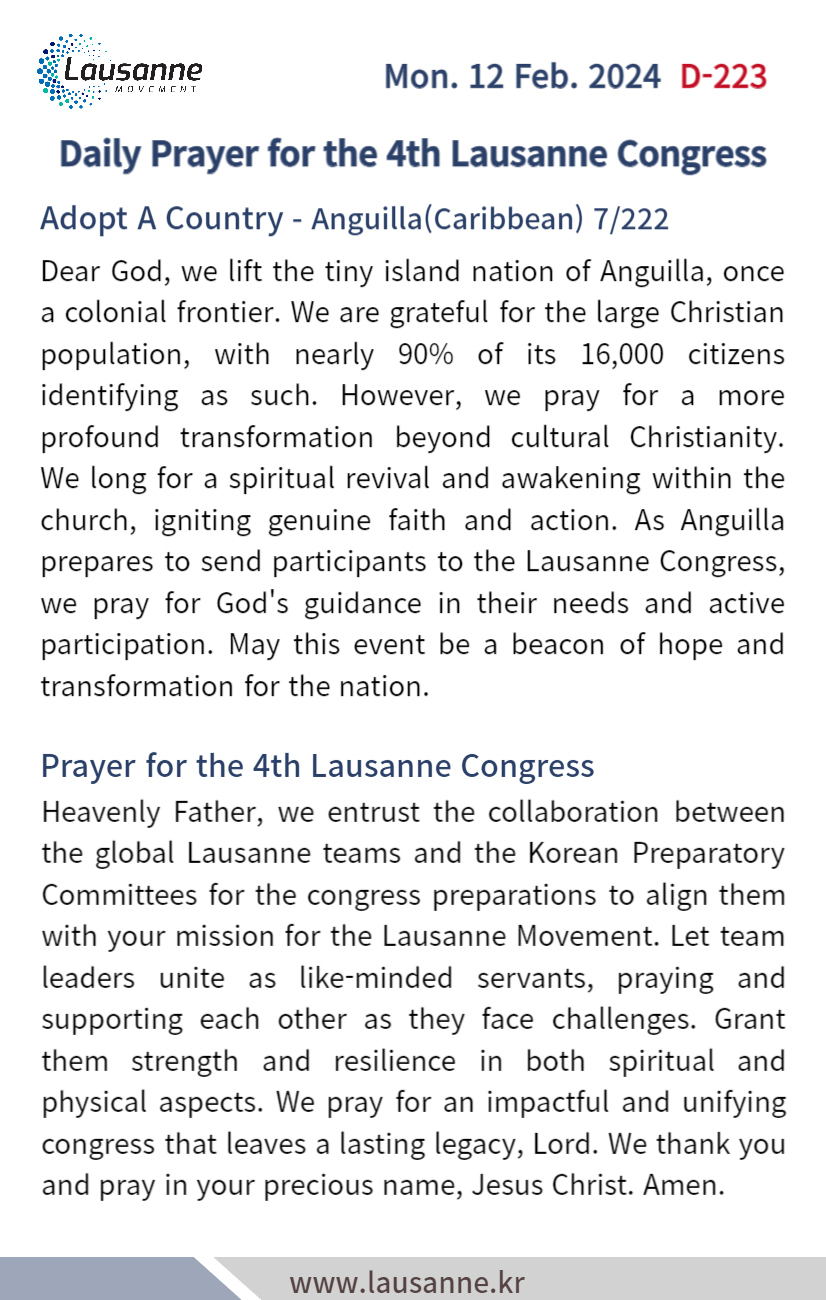 제4차 로잔대회 한국교회 매일합심기도문 2월 12일 작성자 관리자 작성일 2024-02-11 23:33 조회 284 좋아요 0 싫어요 0 인쇄 « 2월 11일 2월 13일 » 목록보기