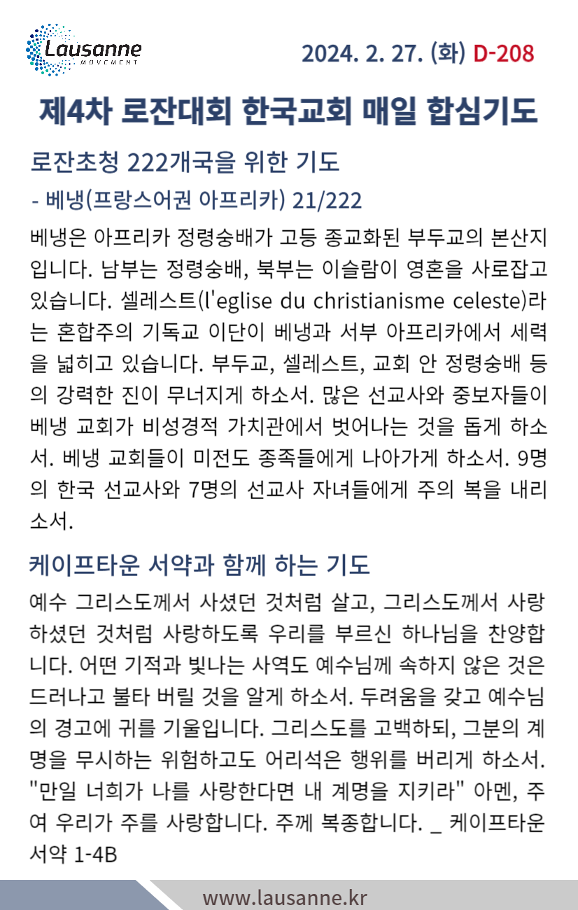 제4차 로잔대회 한국교회 매일합심기도문 2월 27일 작성자 관리자 작성일 2024-02-26 19:27 조회 292 좋아요 0 싫어요 0 인쇄 « 2월 26일 2월 28일 » 목록보기