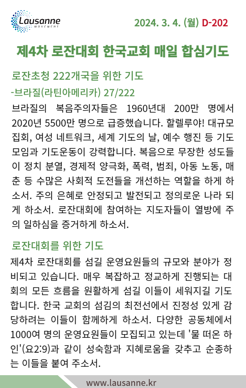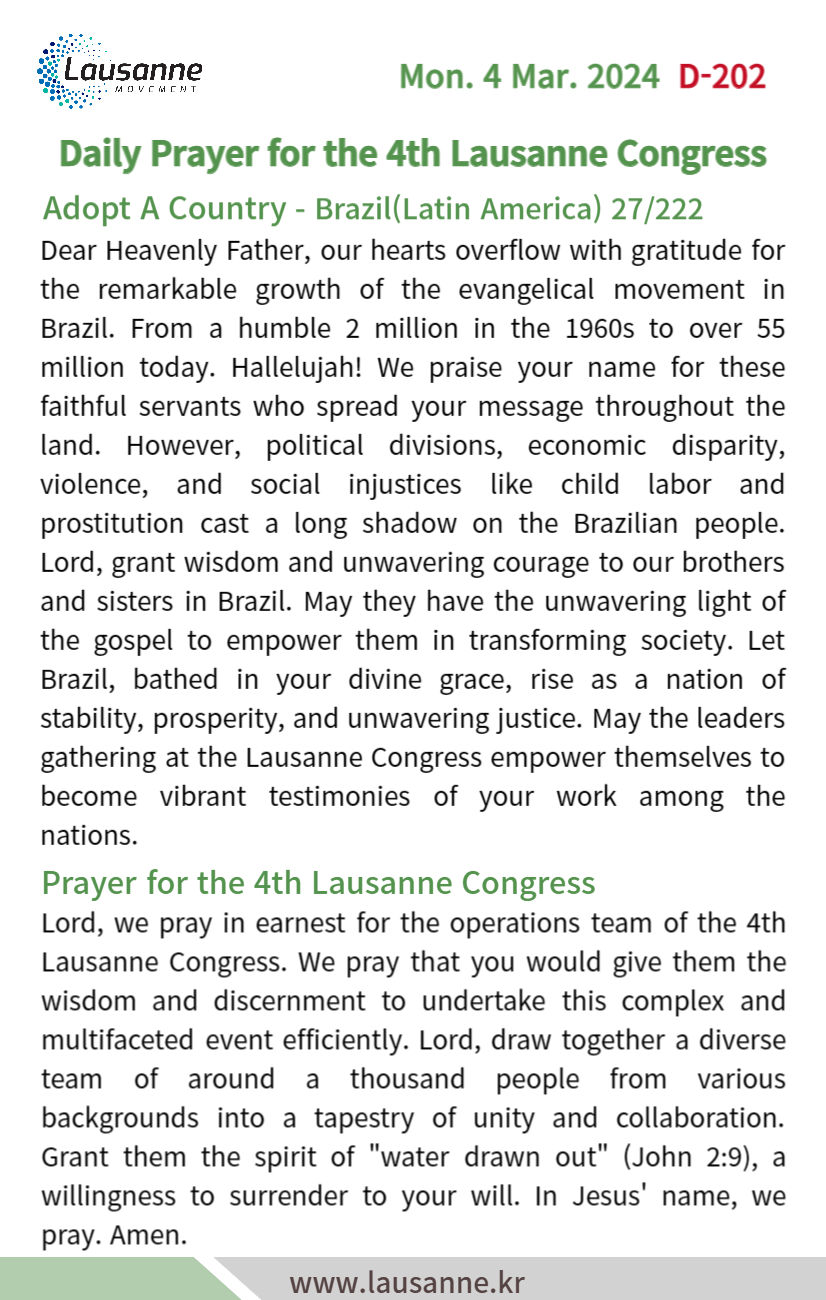 제4차 로잔대회 한국교회 매일합심기도문