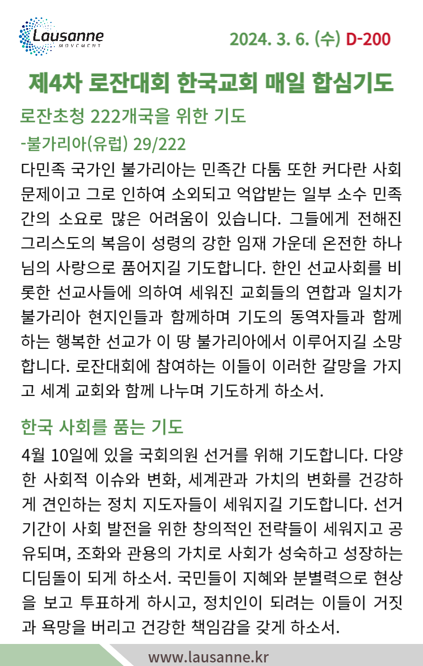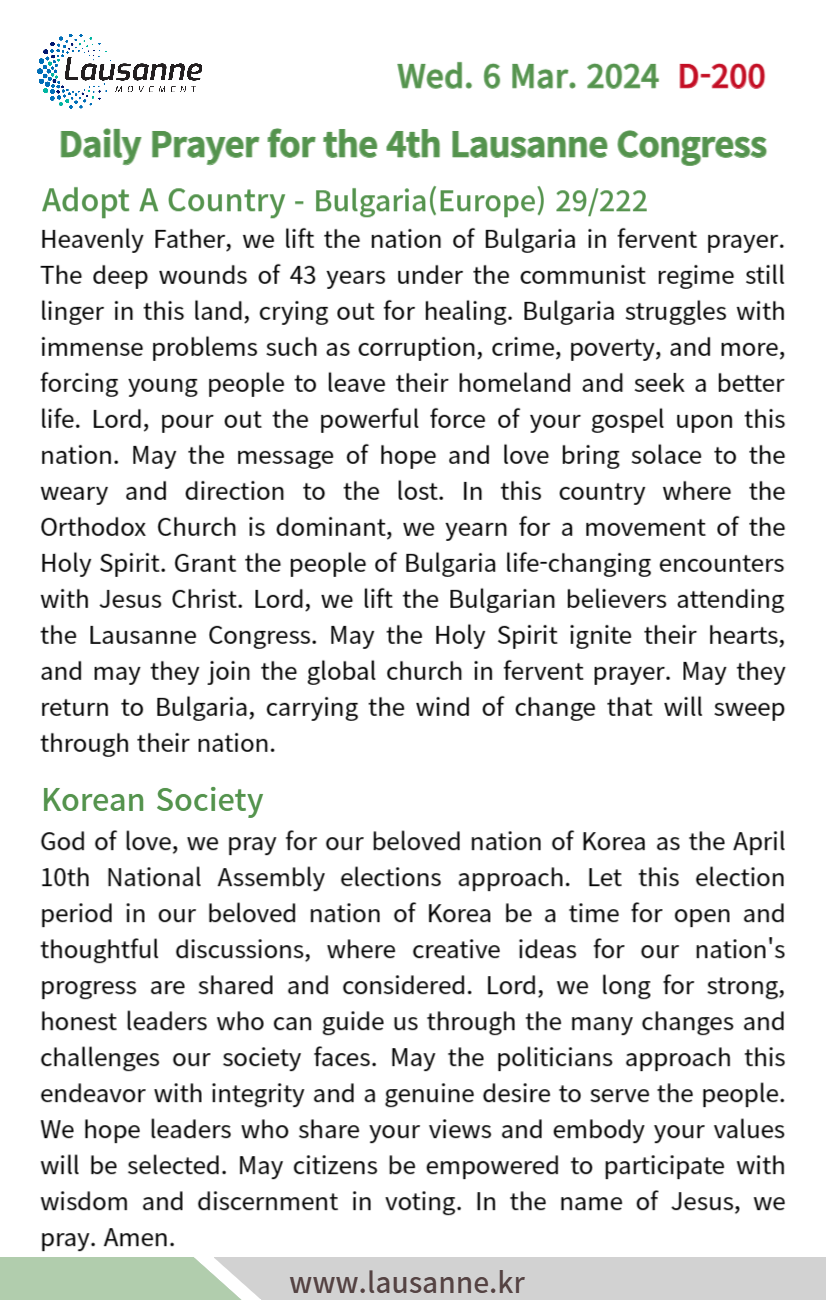 제4차 로잔대회 한국교회 매일합심기도문