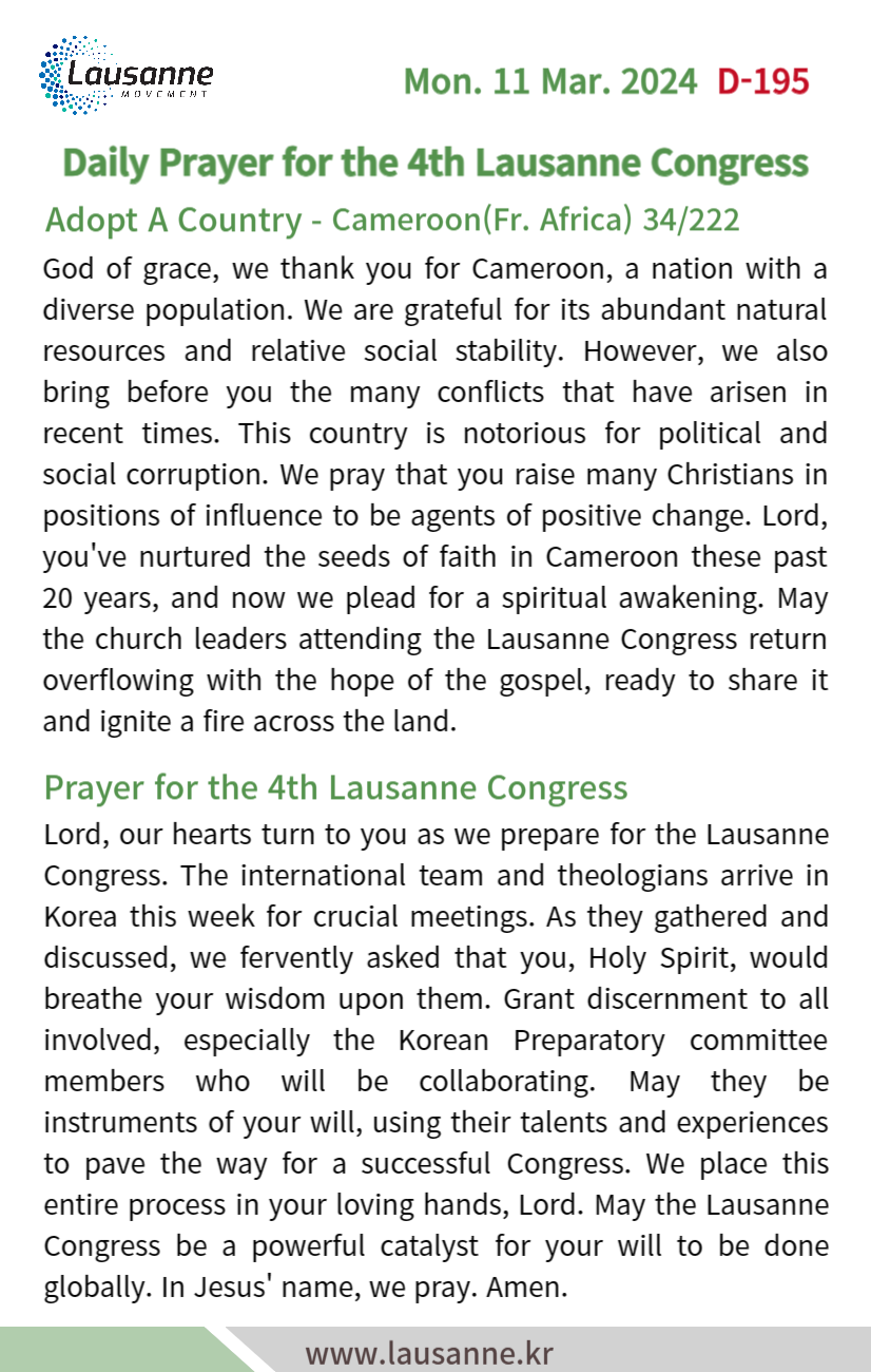 제4차 로잔대회 한국교회 매일합심기도문 3월 11일 작성자 관리자 작성일 2024-03-10 22:18 조회 329 좋아요 0 싫어요 0 인쇄 « 3월 10일 3월 12일 » 목록보기