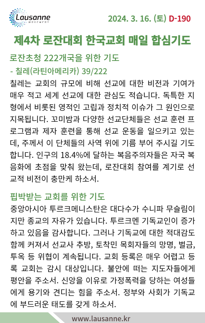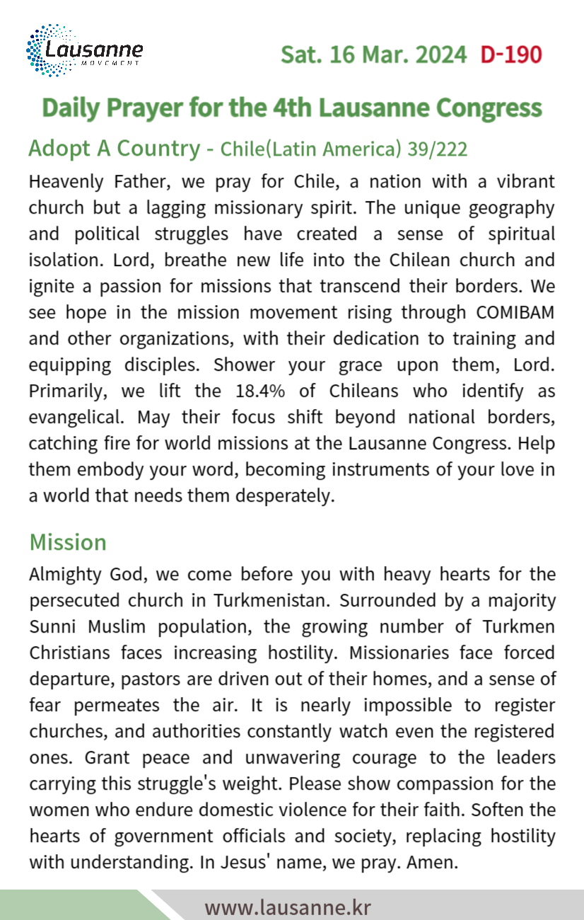 제4차 로잔대회 한국교회 매일합심기도문 3월 16일 작성자 관리자 작성일 2024-03-15 19:28 조회 382 좋아요 0 싫어요 0 인쇄 « 3월 15일 3월 17일 » 목록보기