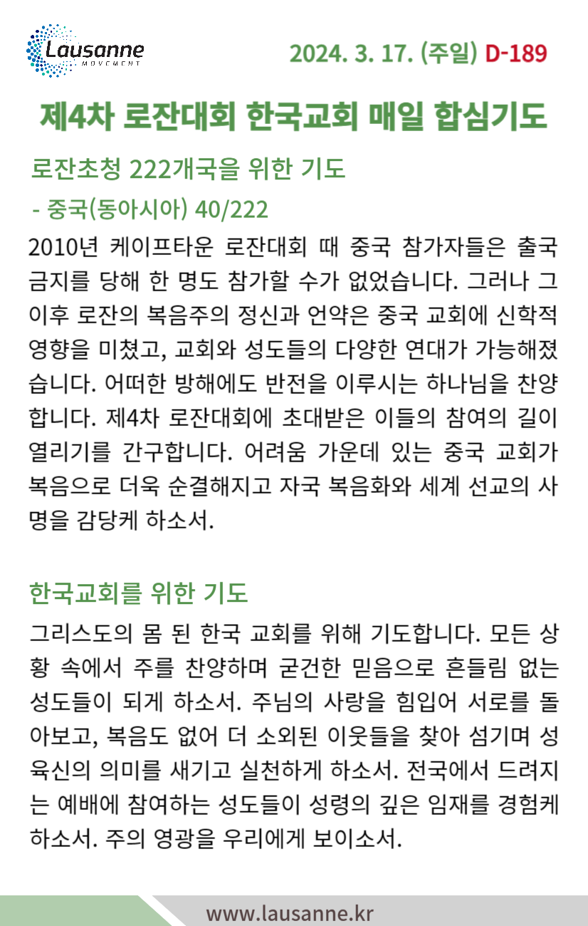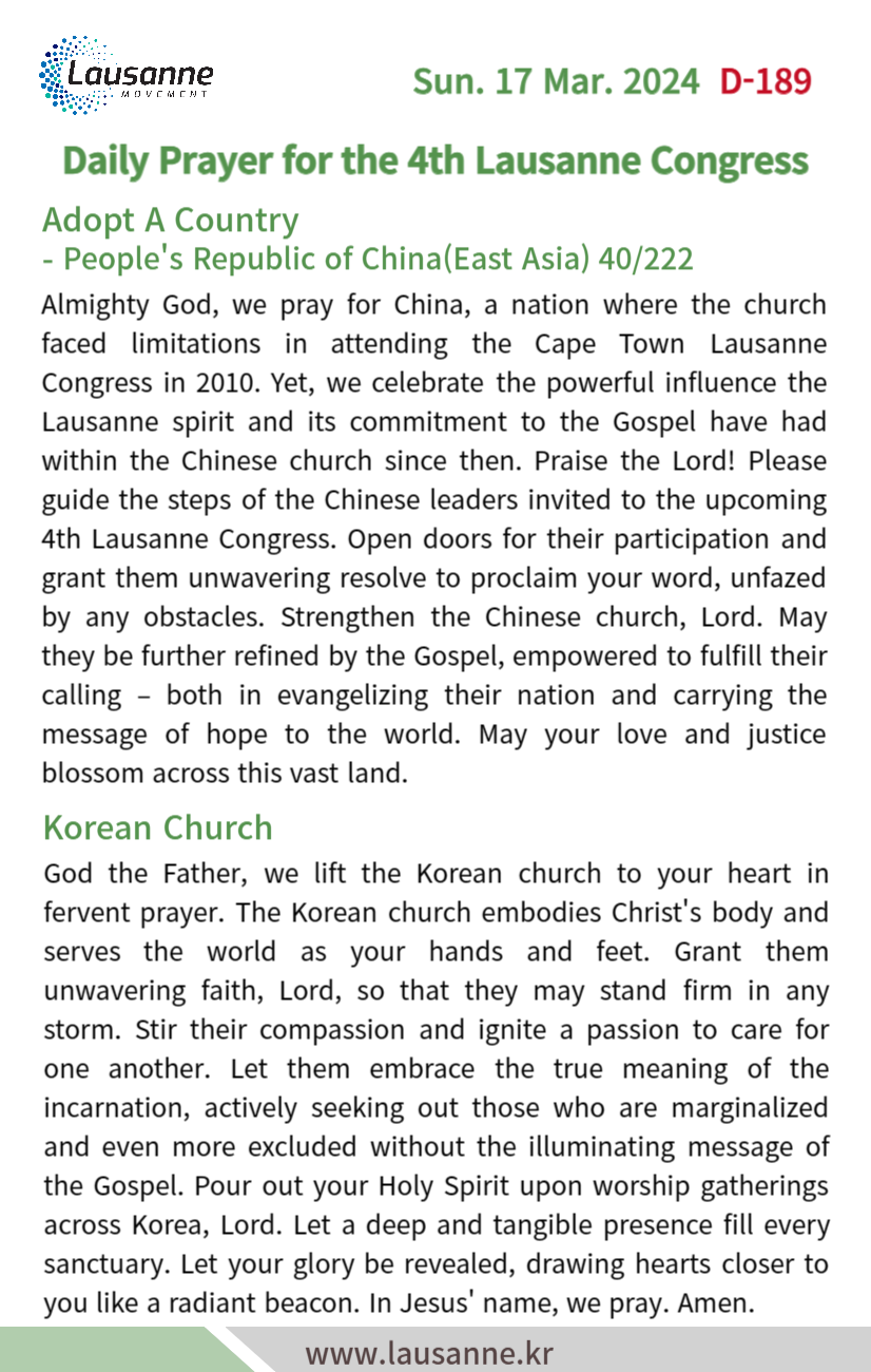 제4차 로잔대회 한국교회 매일합심기도문 3월 17일 작성자 관리자 작성일 2024-03-16 20:05 조회 275 좋아요 0 싫어요 0 인쇄 « 3월 16일 3월 18일 » 목록보기