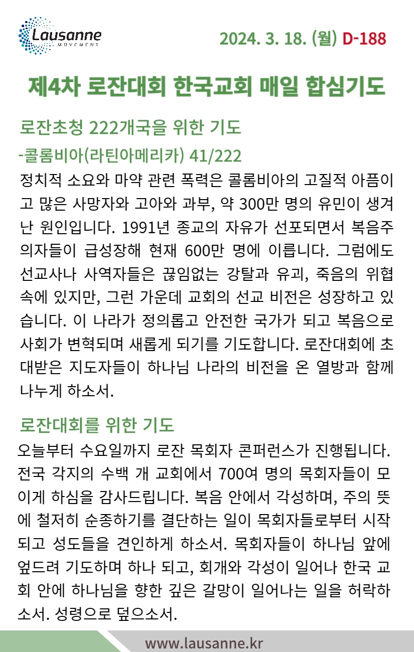 제4차 로잔대회 한국교회 매일합심기도문 3월 18일 작성자 관리자 작성일 2024-03-17 21:45 조회 310 좋아요 0 싫어요 0 인쇄 « 3월 17일 3월 19일 » 목록보기