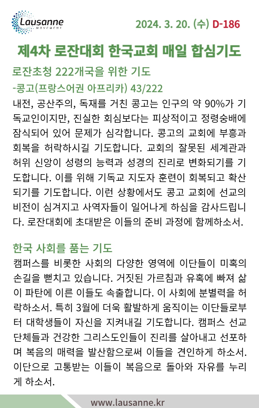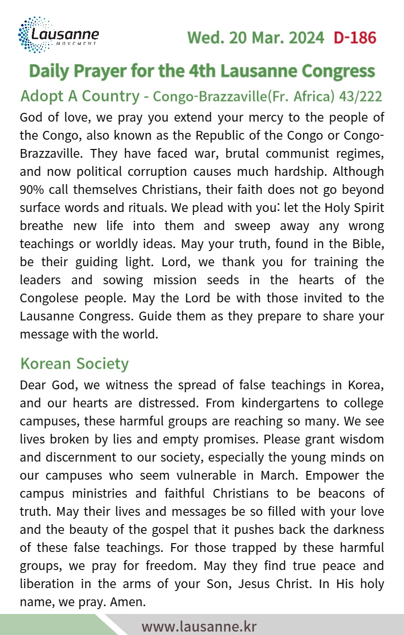 제4차 로잔대회 한국교회 매일합심기도문 3월 20일 작성자 관리자 작성일 2024-03-19 19:00 조회 390 좋아요 0 싫어요 0 인쇄 « 3월 19일 3월 21일 » 목록보기