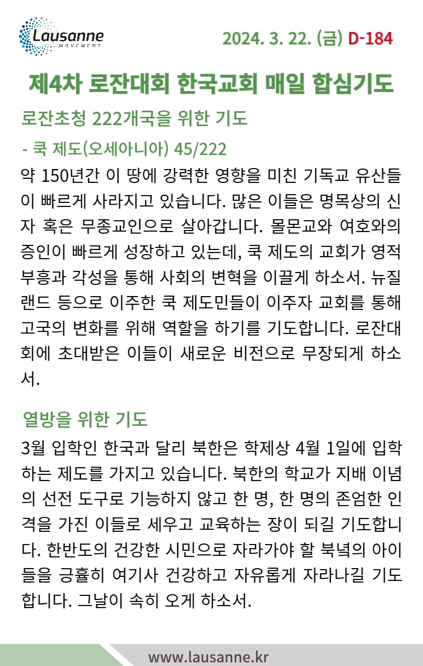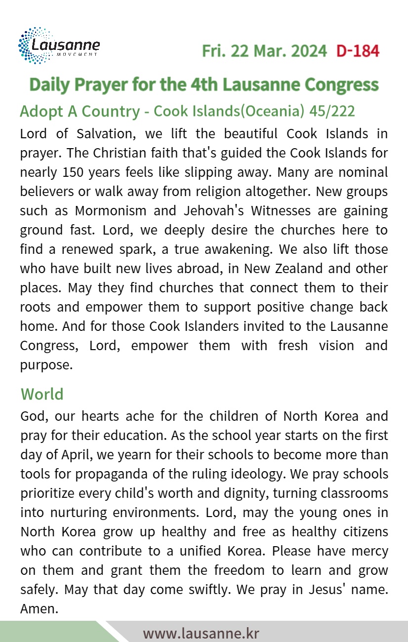제4차 로잔대회 한국교회 매일합심기도문 3월 22일 작성자 관리자 작성일 2024-03-21 21:10 조회 319 좋아요 0 싫어요 0 인쇄 « 3월 21일 3월 23일 » 목록보기