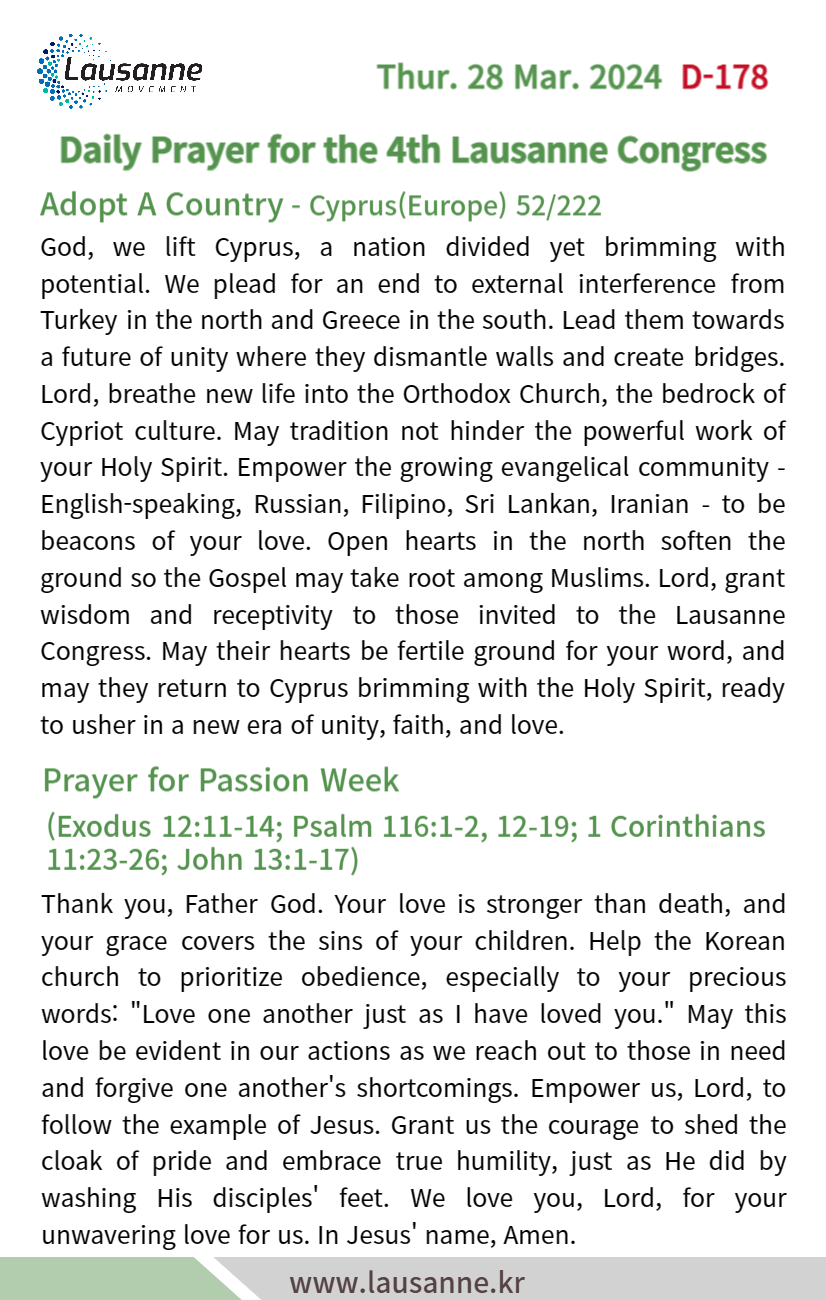 제4차 로잔대회 한국교회 매일합심기도문 3월 28일 작성자 관리자 작성일 2024-03-27 19:06 조회 368 좋아요 0 싫어요 0 인쇄 « 3월 27일 3월 29일 » 목록보기