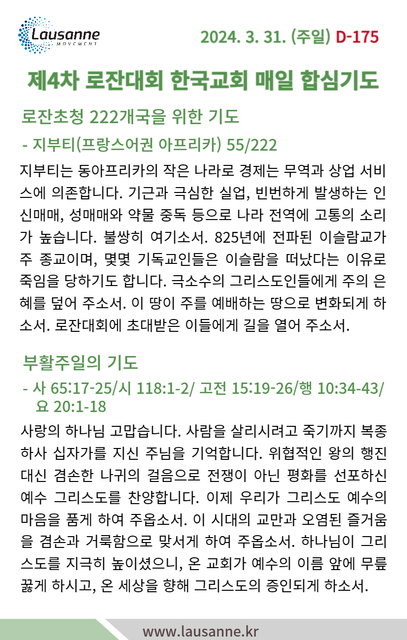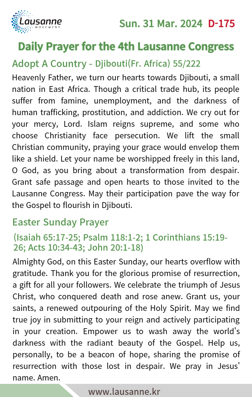 제4차 로잔대회 한국교회 매일합심기도문 3월 31일 작성자 관리자 작성일 2024-03-30 21:25 조회 435 좋아요 0 싫어요 0 인쇄 « 3월 30일 4월 1일 » 목록보기