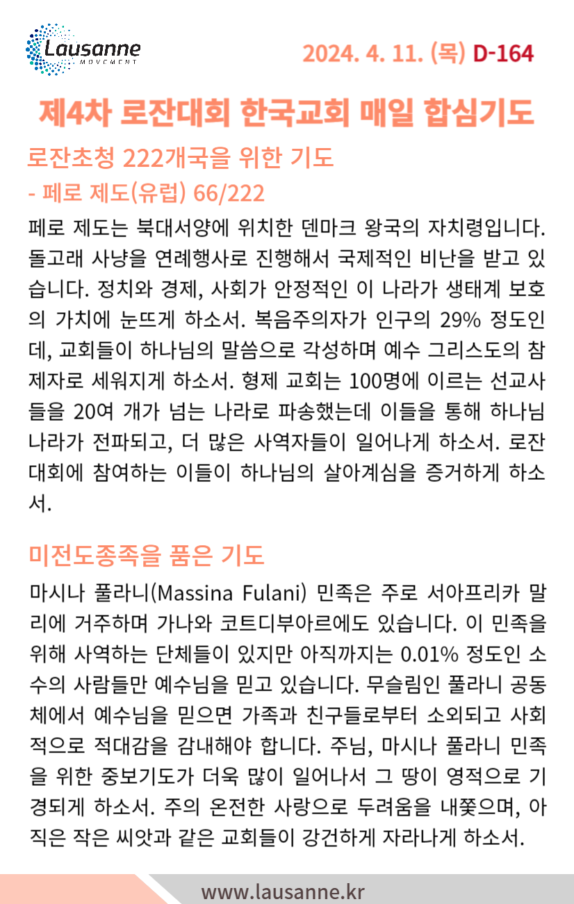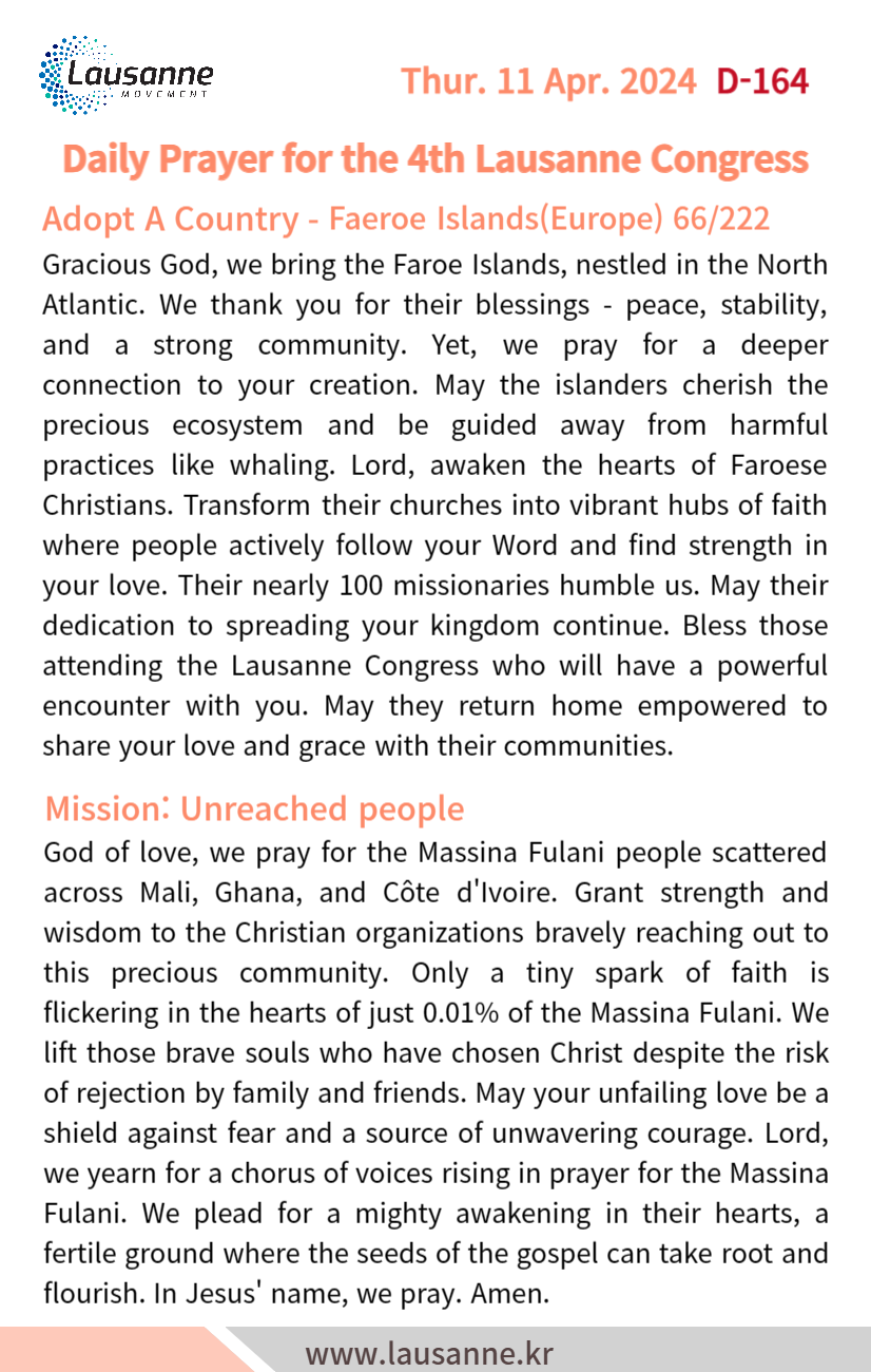 제4차 로잔대회 한국교회 매일합심기도문 4월 11일 작성자 관리자 작성일 2024-04-10 20:41 조회 281 좋아요 0 싫어요 0 인쇄 « 4월 10일 4월 12일 » 목록보기