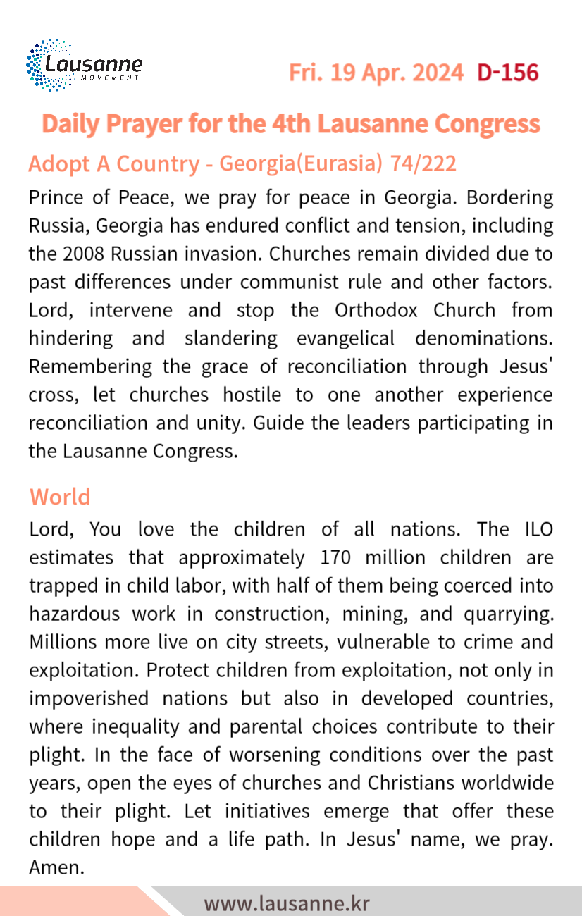 제4차 로잔대회 한국교회 매일합심기도문 4월 19일 작성자 관리자 작성일 2024-04-19 13:34 조회 307 좋아요 0 싫어요 0 인쇄 « 4월 18일 4월 20일 » 목록보기