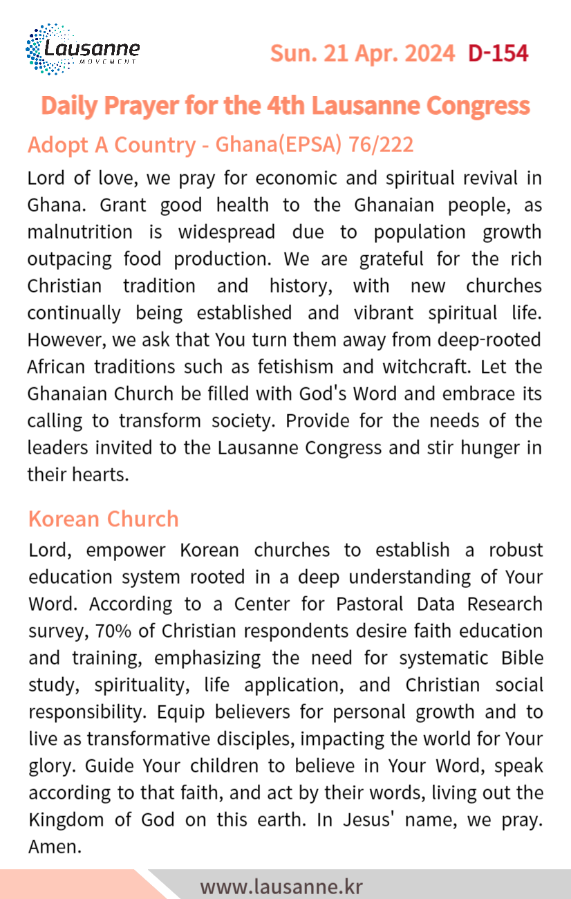 제4차 로잔대회 한국교회 매일합심기도문 4월 21일 작성자 관리자 작성일 2024-04-20 19:09 조회 245 좋아요 0 싫어요 0 인쇄 « 4월 20일 4월 22일 » 목록보기