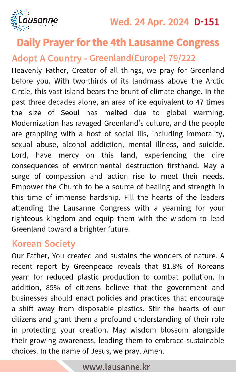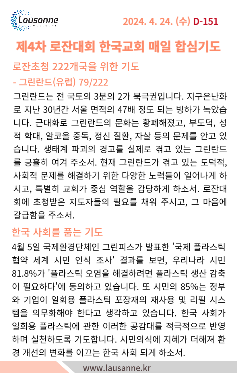 제4차 로잔대회 한국교회 매일합심기도문 4월 24일 작성자 관리자 작성일 2024-04-23 18:52 조회 269 좋아요 0 싫어요 0 인쇄 « 4월 23일 4월 25일 » 목록보기