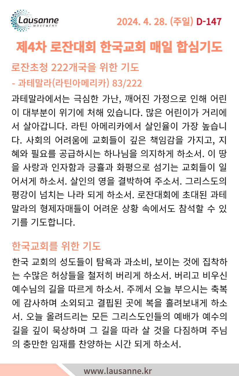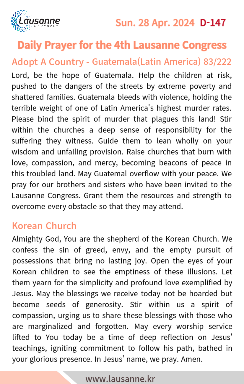 제4차 로잔대회 한국교회 매일합심기도문 4월 28일 작성자 관리자 작성일 2024-04-27 18:52 조회 280 좋아요 0 싫어요 0 인쇄 « 4월 27일 4월 29일 » 목록보기