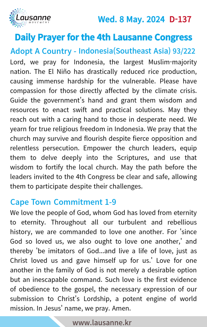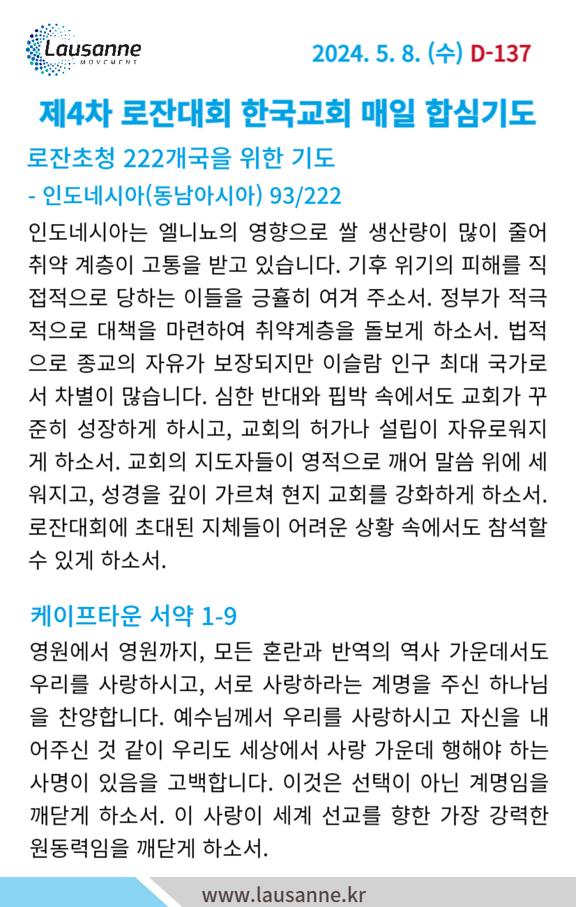 제4차 로잔대회 한국교회 매일합심기도문
