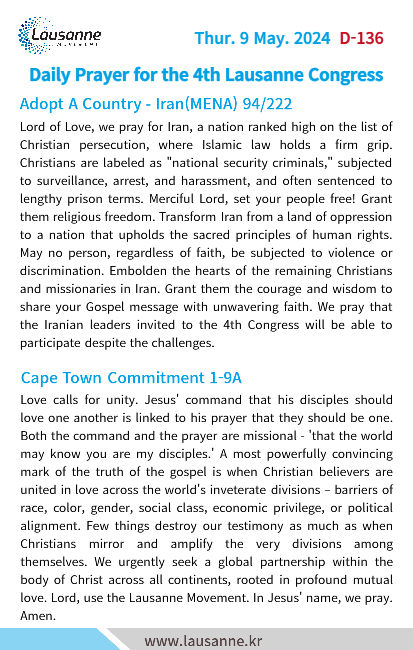 제4차 로잔대회 한국교회 매일합심기도문