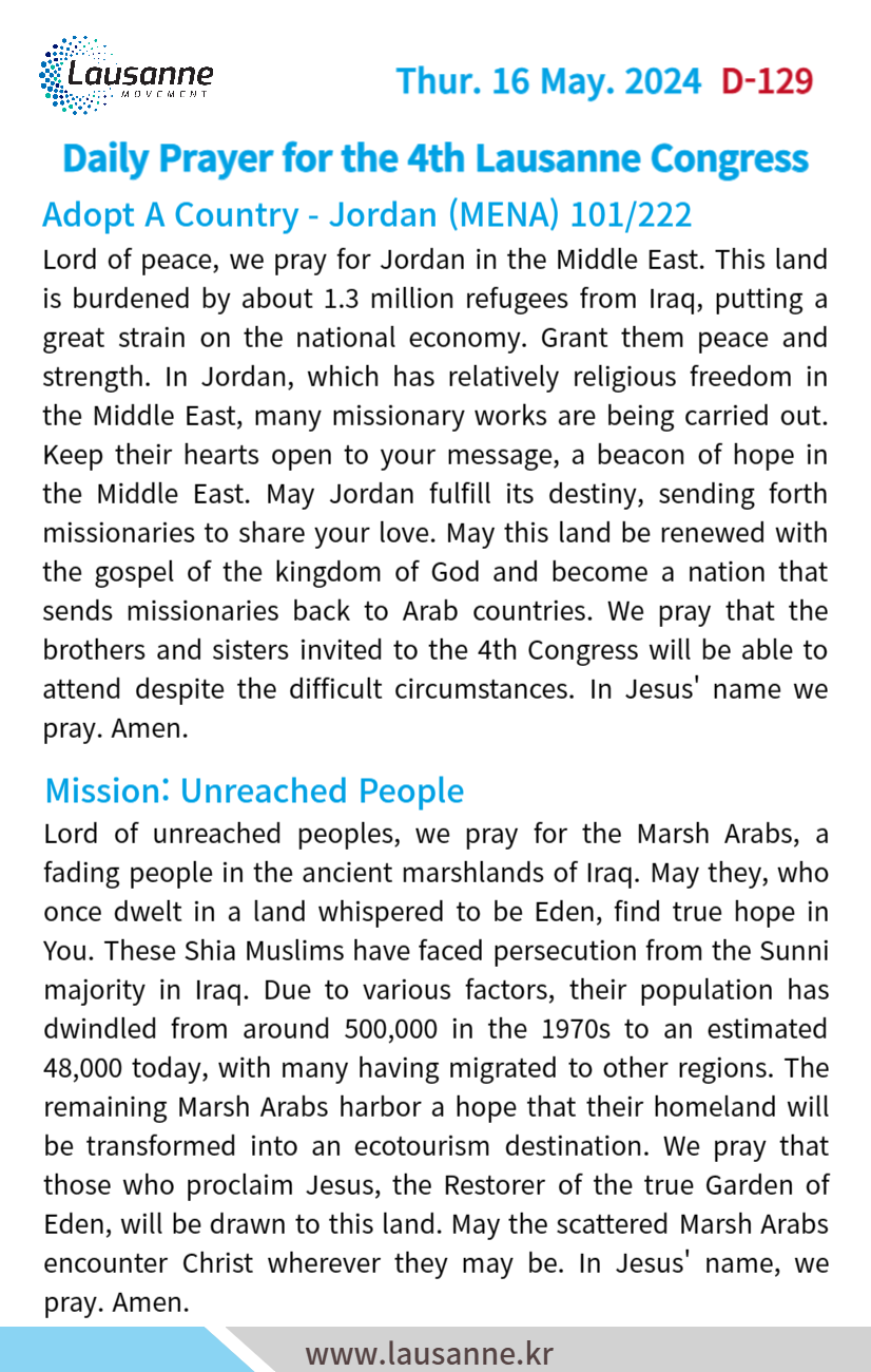 제4차 로잔대회 한국교회 매일합심기도문 5월 16일 작성자 관리자 작성일 2024-05-15 22:01 조회 327 좋아요 0 싫어요 0 인쇄 « 5월 15일 5월 17일 » 목록보기