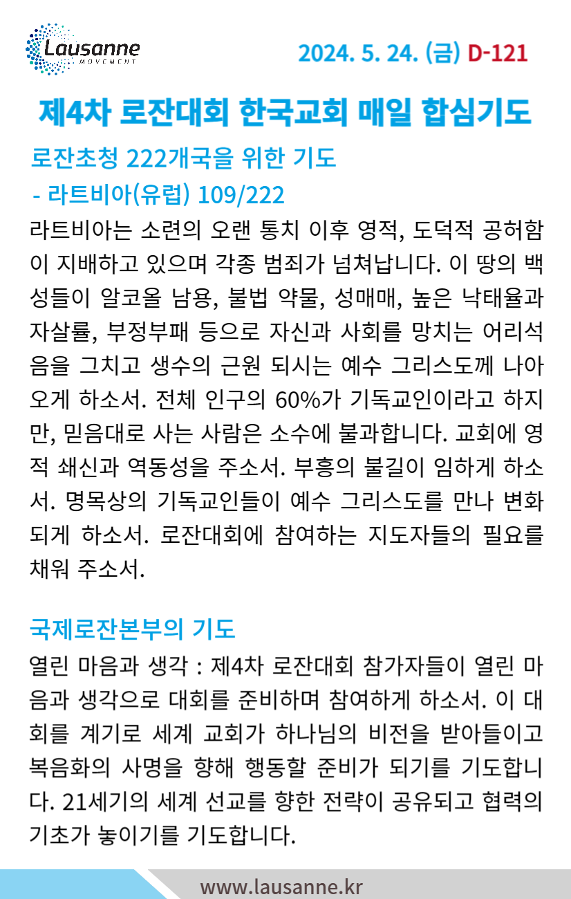 제4차 로잔대회 한국교회 매일합심기도문 5월 24일 작성자 관리자 작성일 2024-05-23 19:58 조회 356 좋아요 0 싫어요 0 인쇄 « 5월 23일 5월 25일 » 목록보기