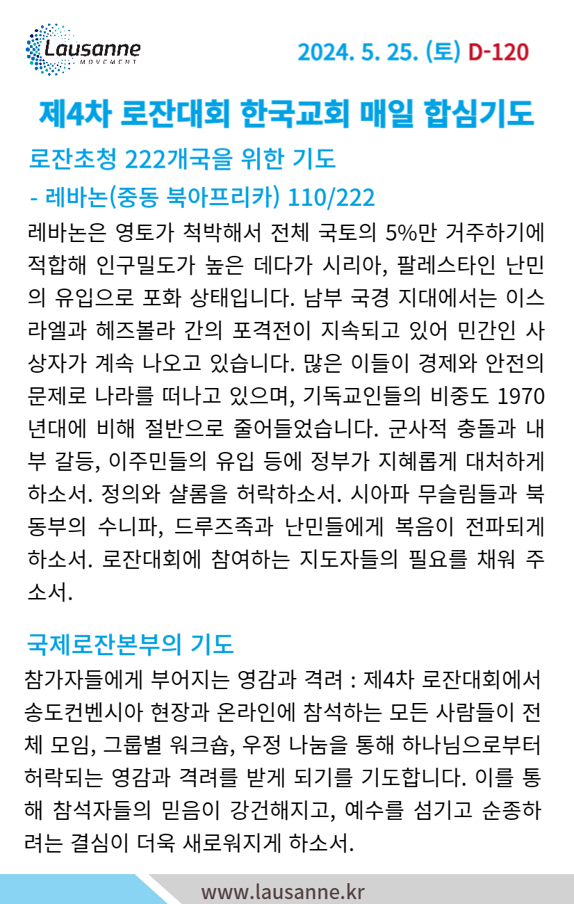 제4차 로잔대회 한국교회 매일합심기도문 5월 25일 작성자 관리자 작성일 2024-05-24 20:01 조회 344 좋아요 0 싫어요 0 인쇄 « 5월 24일 5월 26일 » 목록보기