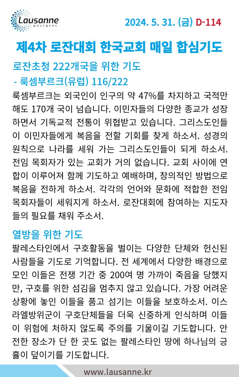 제4차 로잔대회 한국교회 매일합심기도문 5월 31일 작성자 관리자 작성일 2024-05-30 21:46 조회 334 좋아요 0 싫어요 0 인쇄 « 5월 30일 6월 1일 » 목록보기