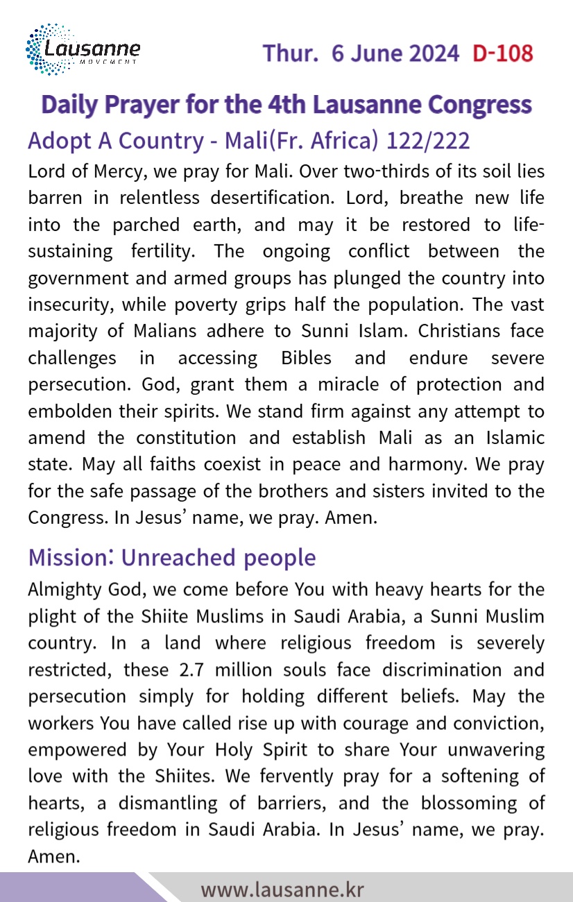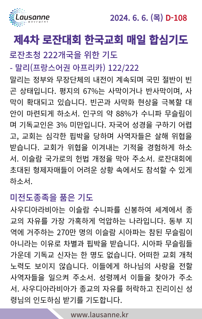 제4차 로잔대회 한국교회 매일합심기도문