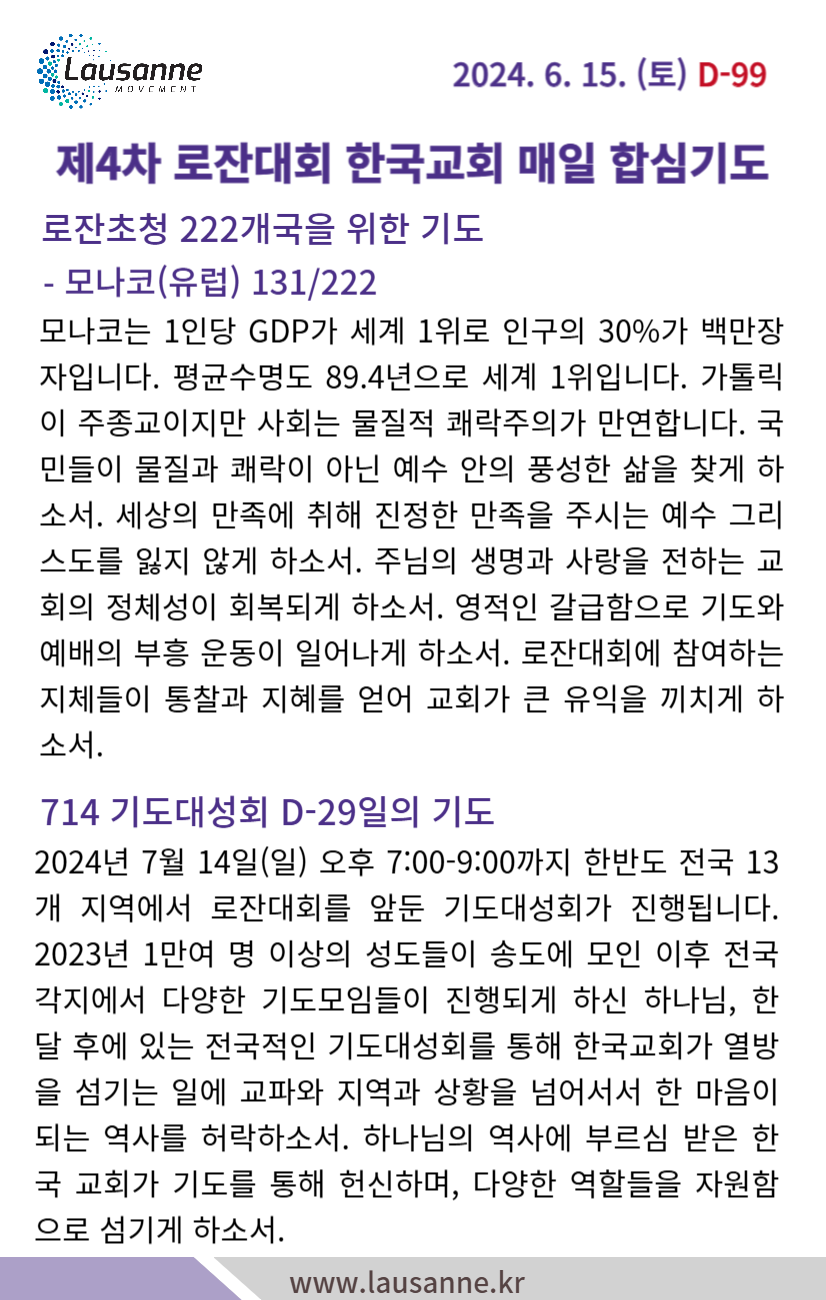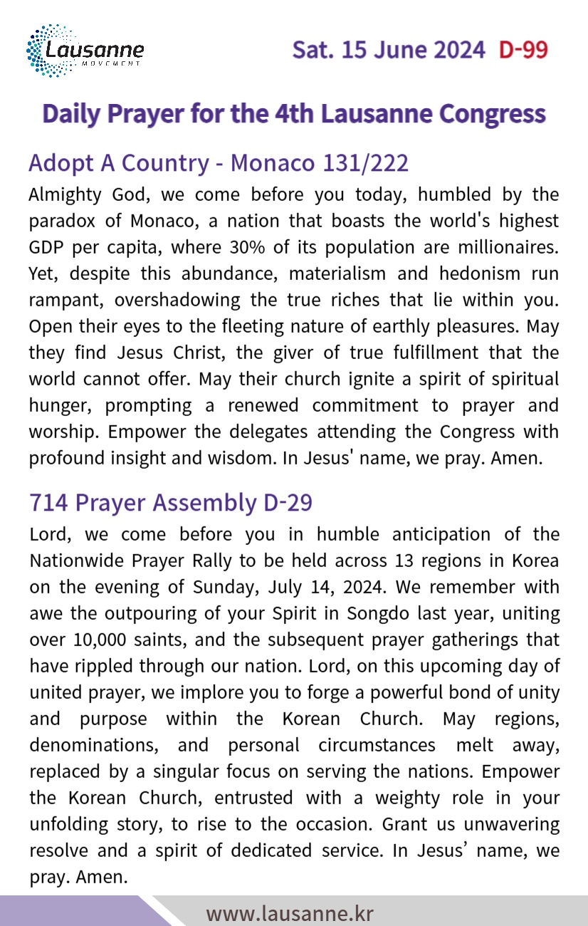 제4차 로잔대회 한국교회 매일합심기도문 6월 15일 작성자 관리자 작성일 2024-06-14 22:02 조회 350 좋아요 0 싫어요 0 인쇄 « 6월 14일 6월 16일 » 목록보기