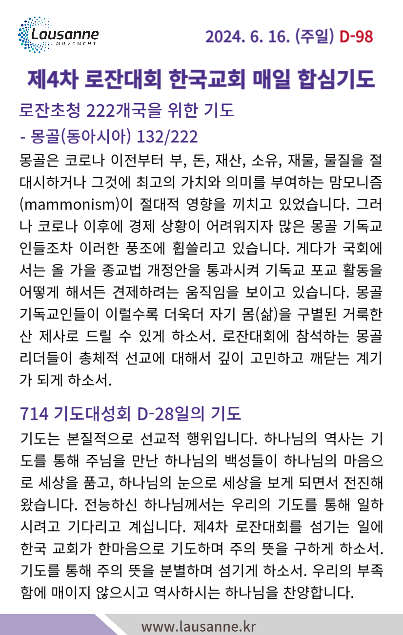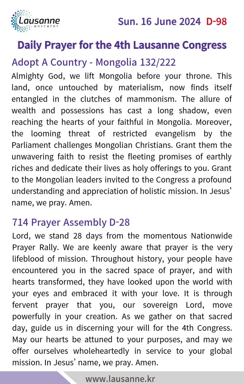 제4차 로잔대회 한국교회 매일합심기도문 6월 16일 작성자 관리자 작성일 2024-06-15 19:33 조회 361 좋아요 0 싫어요 0 인쇄 « 6월 15일 6월 17일 » 목록보기