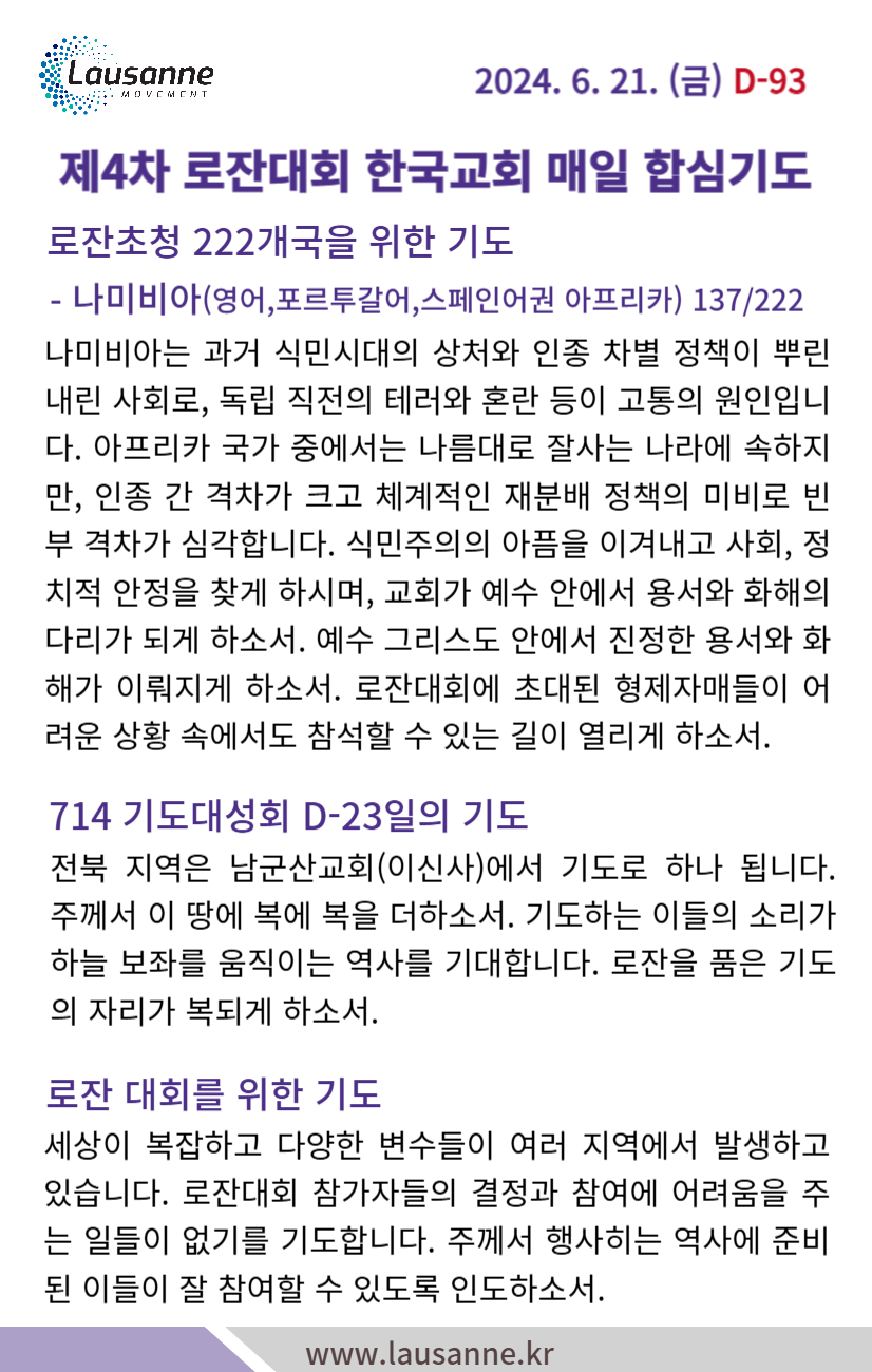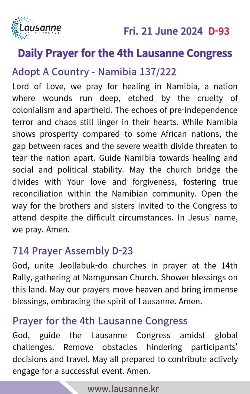 제4차 로잔대회 한국교회 매일합심기도문 6월 21일 작성자 관리자 작성일 2024-06-21 06:25 조회 345 좋아요 0 싫어요 0 인쇄 « 6월 20일 6월 22일 » 목록보기