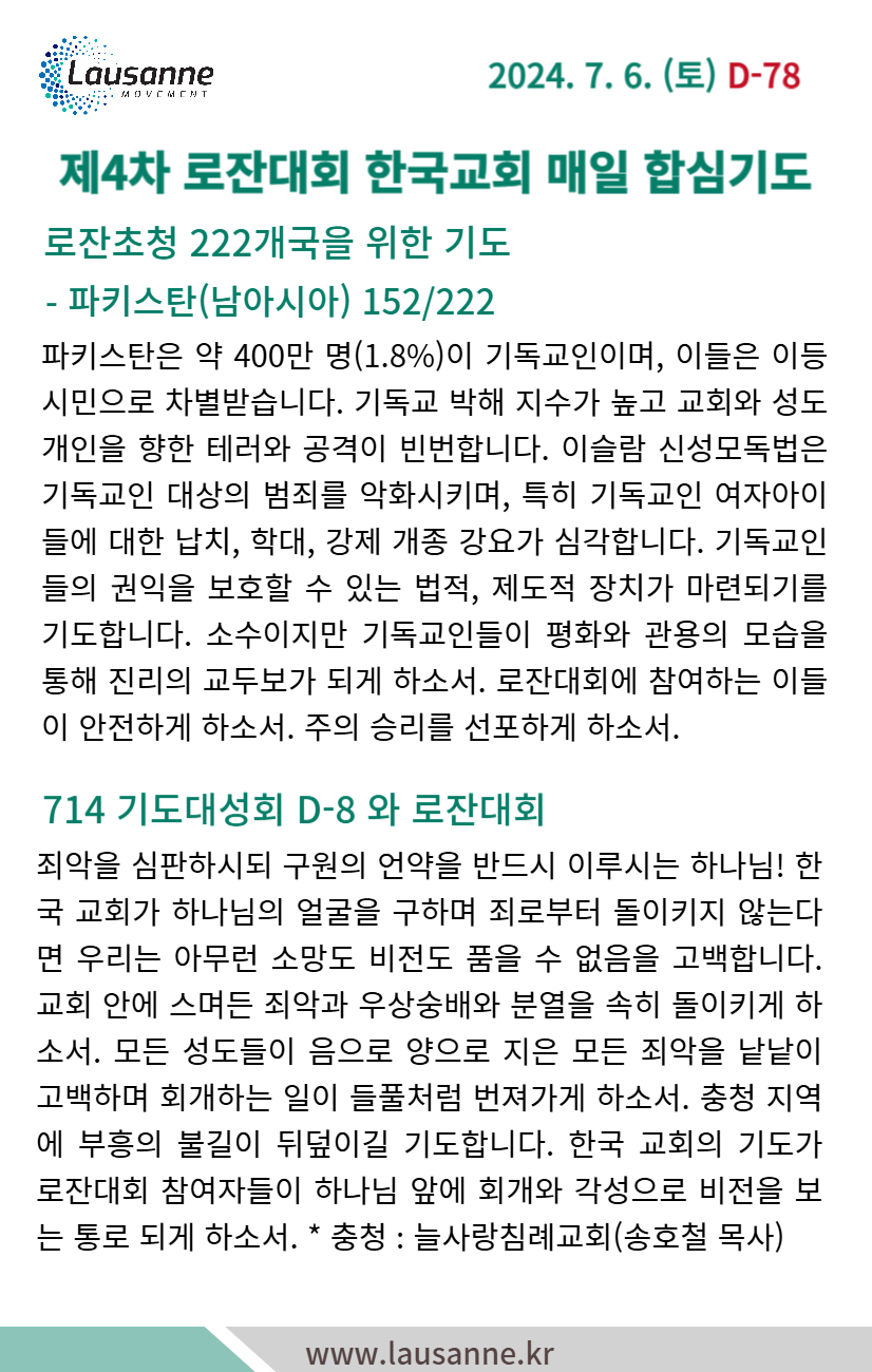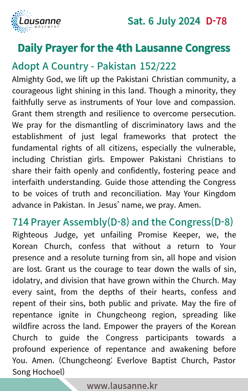 제4차 로잔대회 한국교회 매일합심기도문