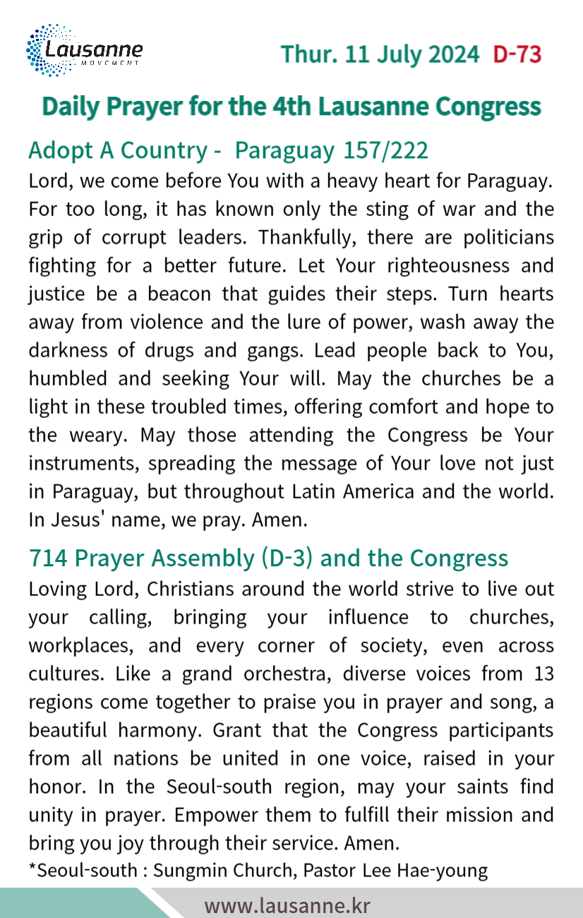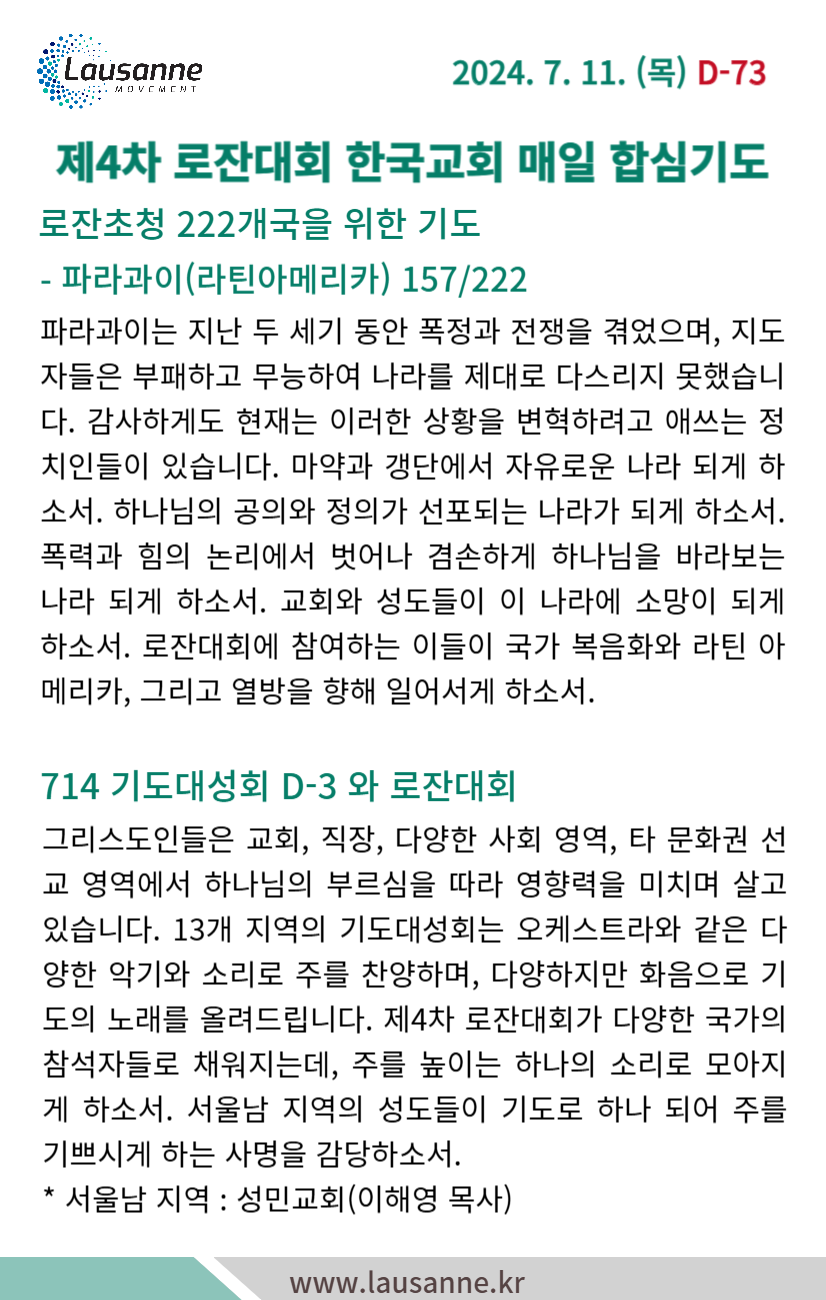 제4차 로잔대회 한국교회 매일합심기도문 7월 11일 작성자 관리자 작성일 2024-07-10 19:57 조회 323 좋아요 0 싫어요 0 인쇄 « 7월 10일 7월 12일 » 목록보기