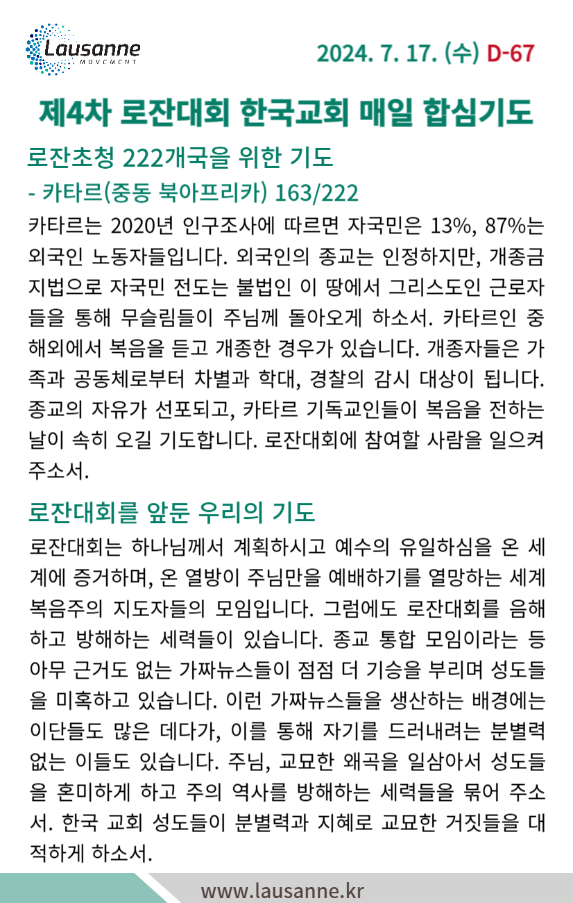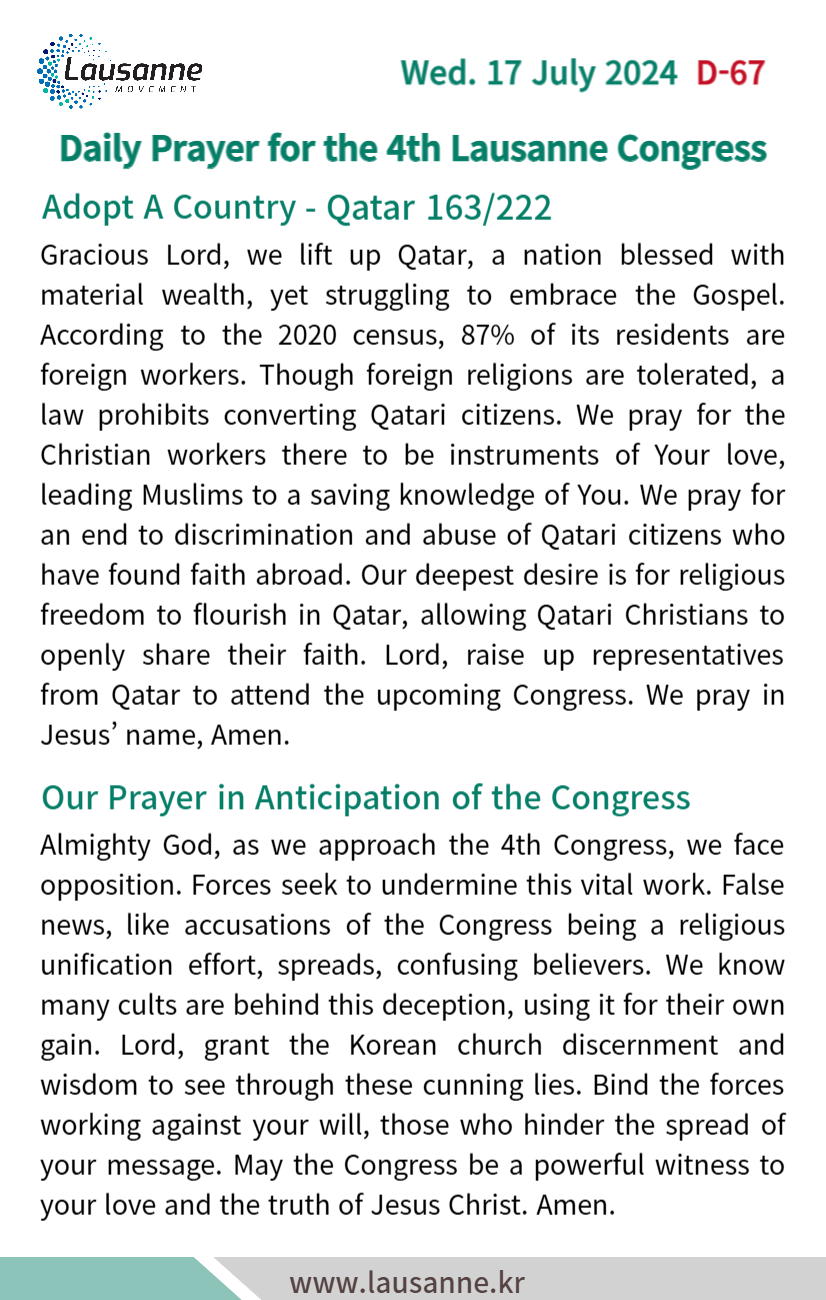 제4차 로잔대회 한국교회 매일합심기도문 7월 17일 작성자 관리자 작성일 2024-07-16 18:17 조회 391 좋아요 0 싫어요 0 인쇄 « 7월 16일 7월 18일 » 목록보기