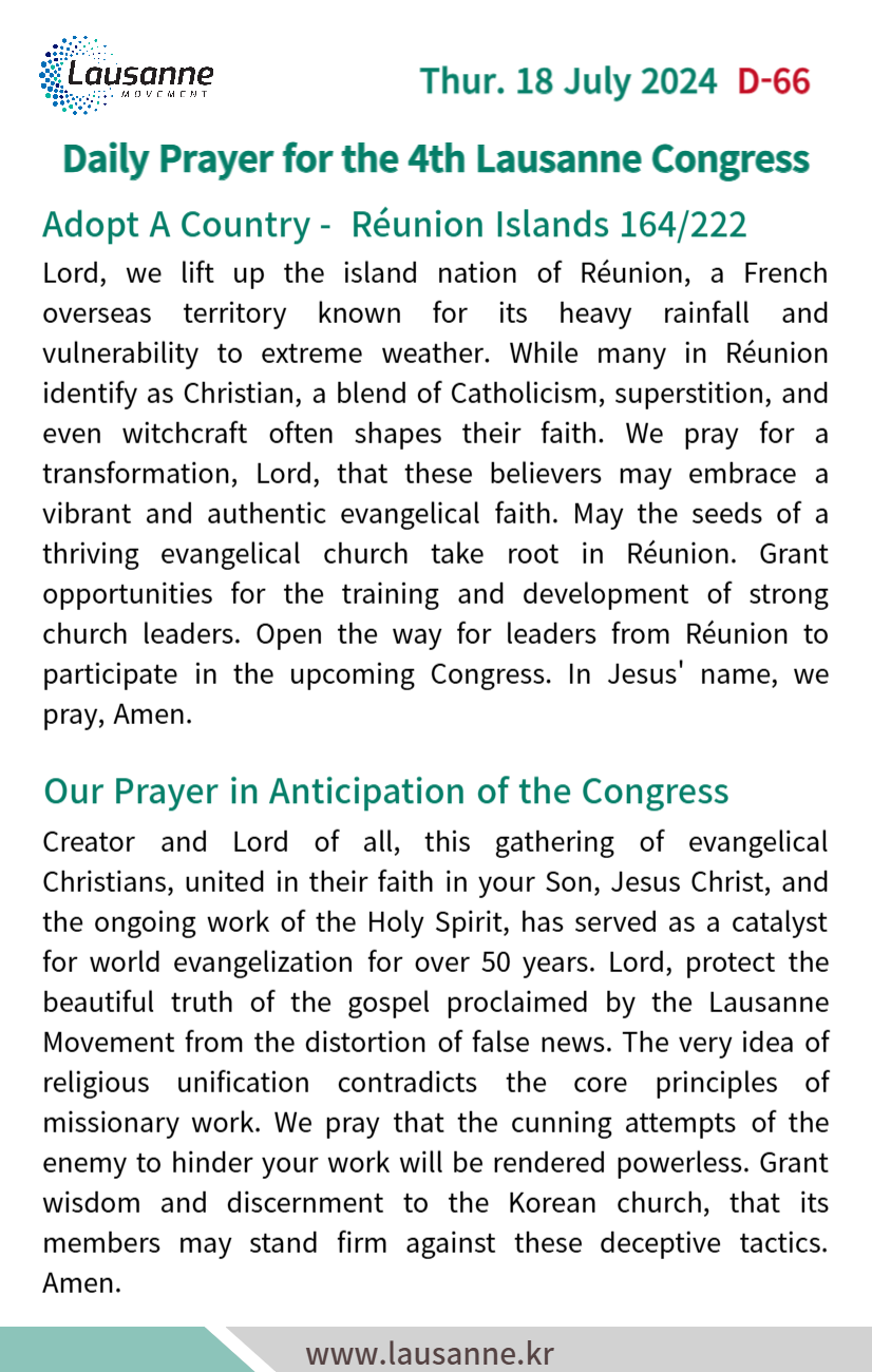 제4차 로잔대회 한국교회 매일합심기도문 7월 18일 작성자 관리자 작성일 2024-07-17 18:06 조회 429 좋아요 0 싫어요 0 인쇄 « 7월 17일 7월 19일 » 목록보기