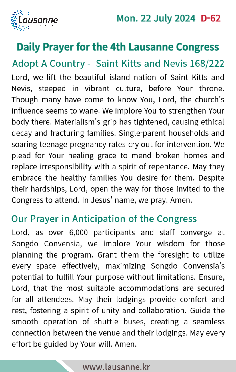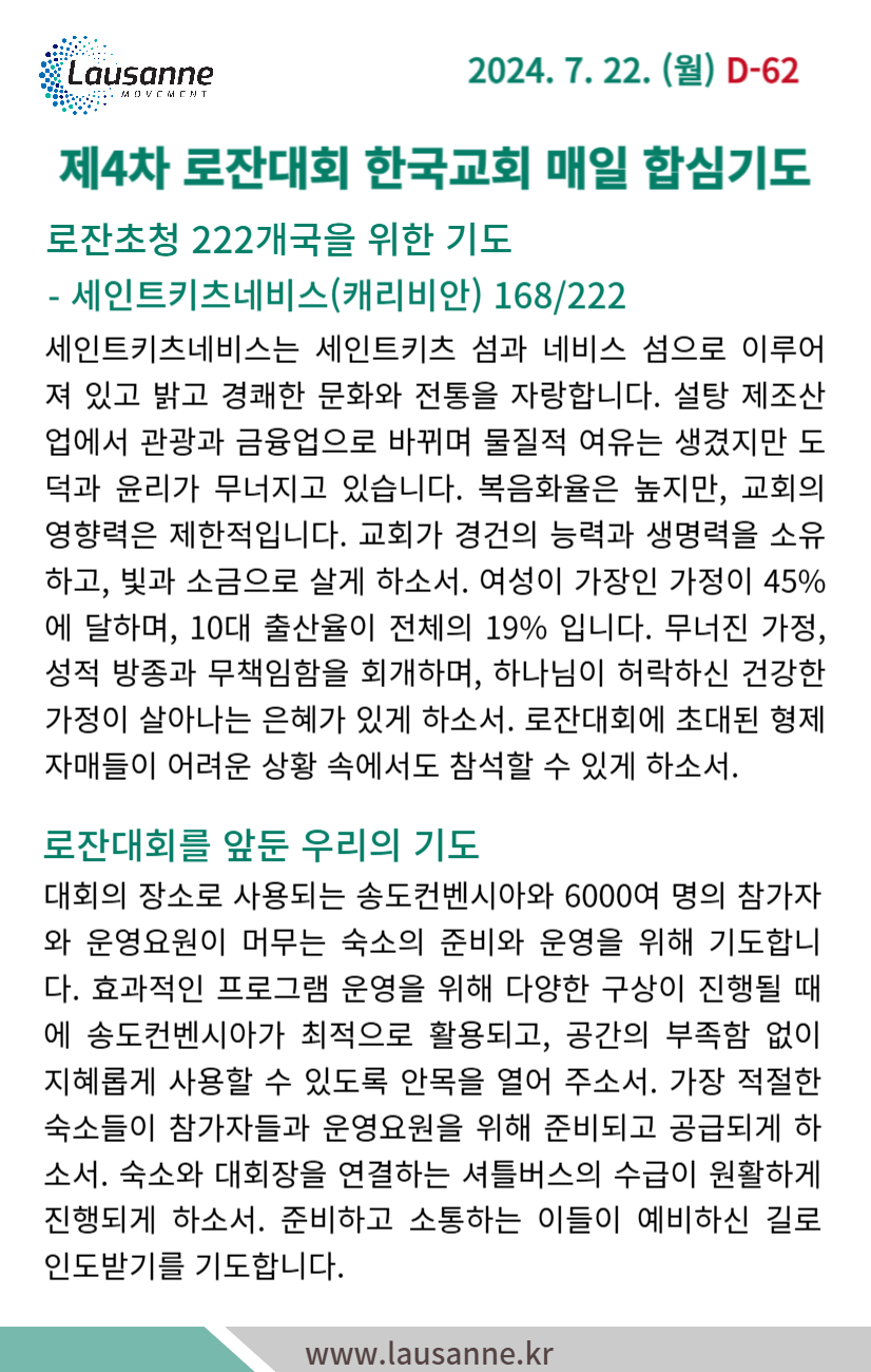 제4차 로잔대회 한국교회 매일합심기도문 7월 22일 작성자 관리자 작성일 2024-07-21 19:25 조회 340 좋아요 0 싫어요 0 인쇄 « 7월 21일 7월 23일 » 목록보기